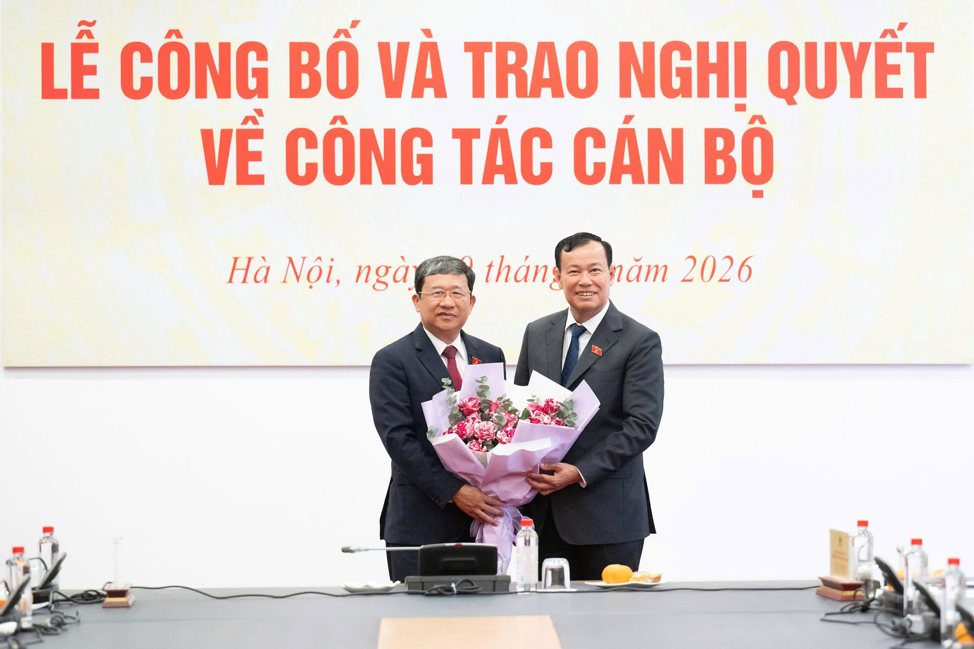 Phó Chủ tịch Quốc hội Trần Quang Phương trao Nghị quyết của Ủy ban Thường vụ Quốc hội cho ông Vũ Hải Hà. Ảnh: QH
