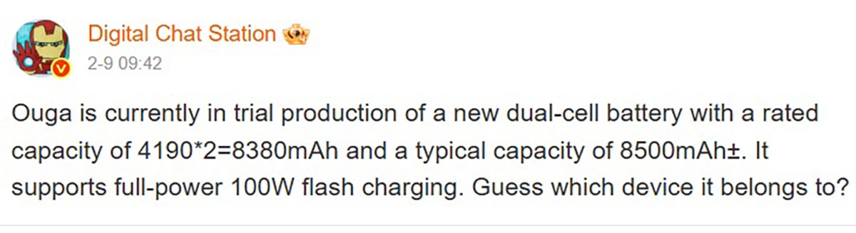 Nguồn tin từ leaker Digital Chat Station cho biết, OPPO đã bắt đầu sản xuất thử nghiệm một bộ pin kép mới với dung lượng điển hình đạt mức 8,500mAh. Cụ thể, thiết bị thử nghiệm bao gồm hai viên pin dung lượng 4,190mAh kết hợp lại, tạo ra tổng dung lượng định mức là 8,380mAh và dự kiến sẽ được quảng bá ở mức 8,500mAh khi ra mắt chính thức.