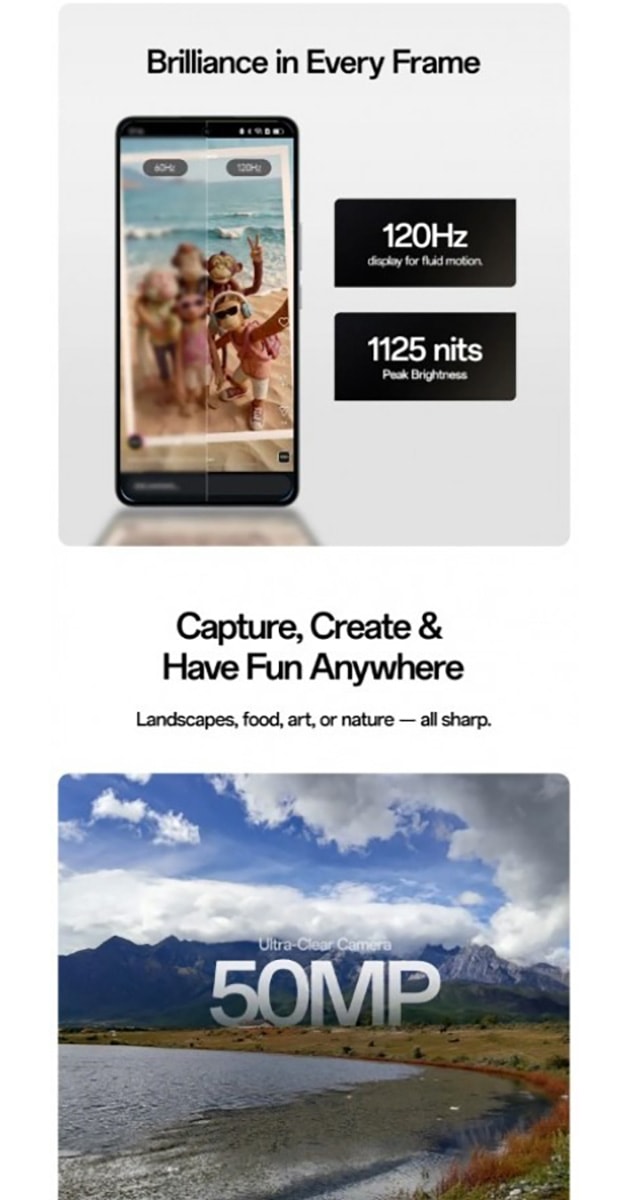 Màn hình của máy có tần số quét 120Hz, mang lại trải nghiệm cuộn mượt mà. Độ sáng tối đa đạt mức 1,125 nits, hỗ trợ tốt việc quan sát nội dung dưới ánh sáng mạnh. Theo các nguồn tin kỹ thuật, nhiều khả năng thiết bị này sẽ sử dụng tấm nền LCD để tối ưu hóa chi phí sản xuất.