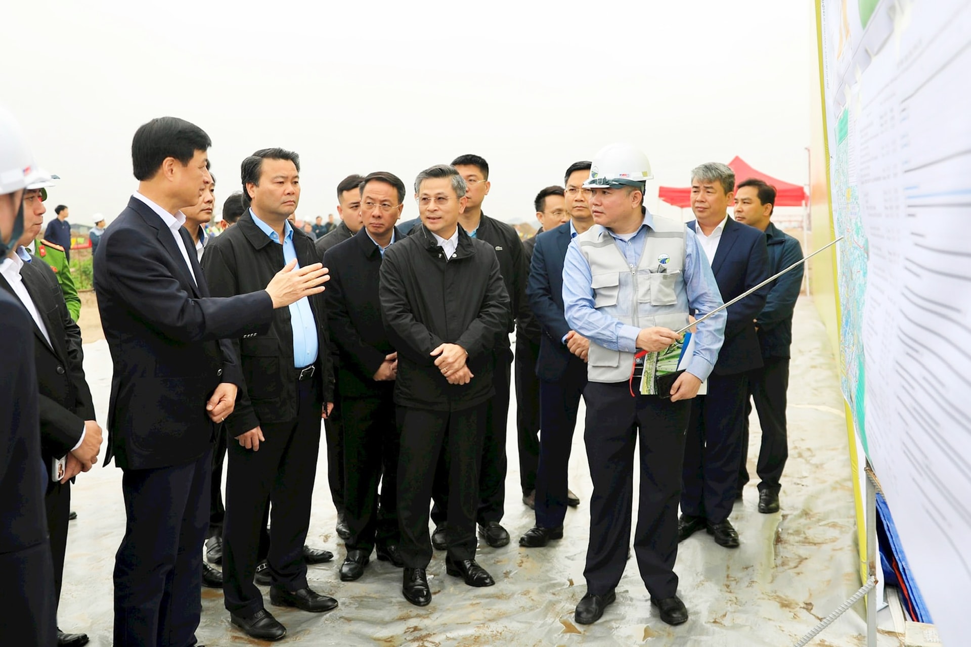 Bí thư Thành ủy Hà Nội Nguyễn Duy Ngọc kiểm tra tiến độ thi công công trình cầu Hồng Hà. Ảnh: Quang Thái