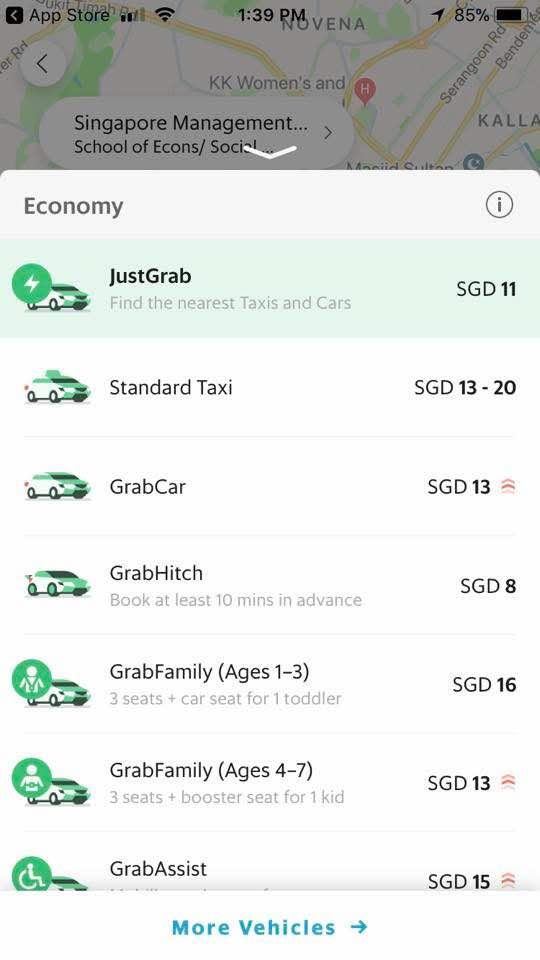 Chẳng hạn trong một chuyến đi dưới đây, dịch vụ taxi thông thường có giá khởi điểm 11 SGD (khoảng 8,46 USD) nhưng nếu khách hàng chọn taxi cho 3 người kèm một ghế em bé, giá chuyến đi sẽ tăng lên thành 16 SGD, tức khoảng 12,3 USD.