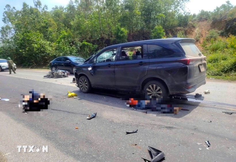 Hiện trường xảy ra vụ va chạm giữa ôtô và xe máy. Ảnh: TTXVN phát.