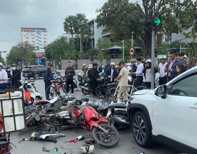 Cú va chạm mạnh khiến khoảng 10 xe máy bị húc văng, nằm ngổn ngang trên mặt đường, nhiều phương tiện hư hỏng nặng. Hơn 10 người đi xe máy bị thương, trong đó có một cháu nhỏ bị cuốn vào gầm ôtô, được người dân nhanh chóng đưa đi cấp cứu.