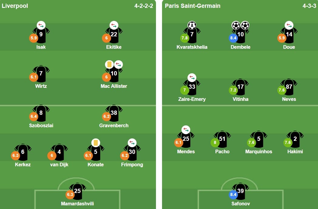 Trong lúc Liverpool mải mê tấn công, đẳng cấp của PSG đã lên tiếng. Phút 72, Khvicha Kvaratskhelia kiến tạo thông minh để Ousmane Dembele xử lý tinh tế trước khi tung cú cứa lòng đẳng cấp đánh bại thủ môn Mamardashvili. Đến phút 90+1, từ đường dọn cỗ của Bradley Barcola, Dembele hoàn tất cú đúp với pha dứt điểm quyết đoán, ấn định chiến thắng 2-0.