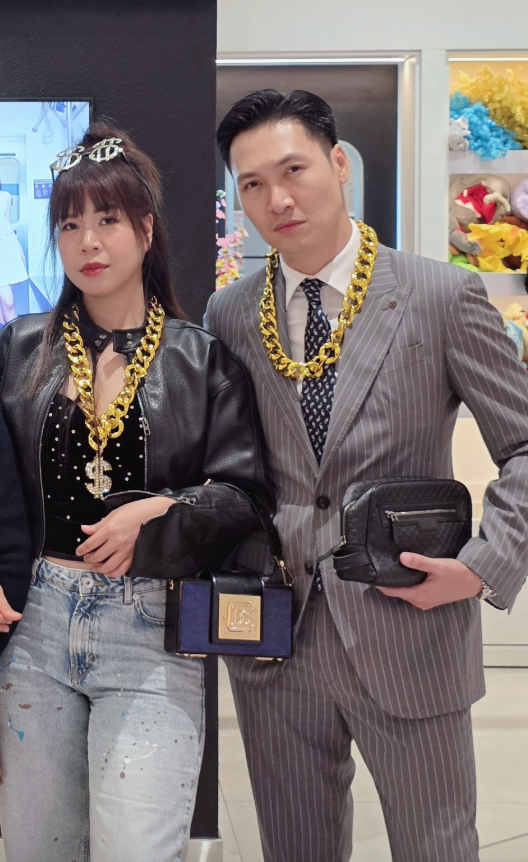 Trong bức ảnh, Mạnh Trường lựa chọn vest kẻ chỉn chu nhưng không quá nghiêm nghị, tạo cảm giác lịch lãm mà vẫn thoải mái. Vợ anh xuất hiện với phong cách trẻ trung, pha chút cá tính, tạo nên tổng thể hài hòa. Điểm nhấn của cả hai chính là những phụ kiện ánh kim cỡ lớn - chi tiết khiến outfit trở nên nổi bật và cũng là yếu tố khiến cư dân mạng bàn luận sôi nổi.
