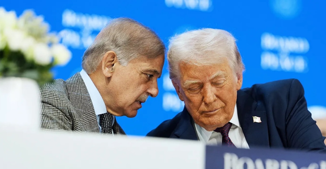 Tổng thống Mỹ Donald Trump (phải) trao đổi với Thủ tướng Pakistan Mian Muhammad Shehbaz Sharif trong lễ ký kết Hiến chương Hội đồng Hòa bình tại Hội nghị thường niên Diễn đàn Kinh tế Thế giới ở Davos, Thụy Sĩ. Ảnh: Monocle