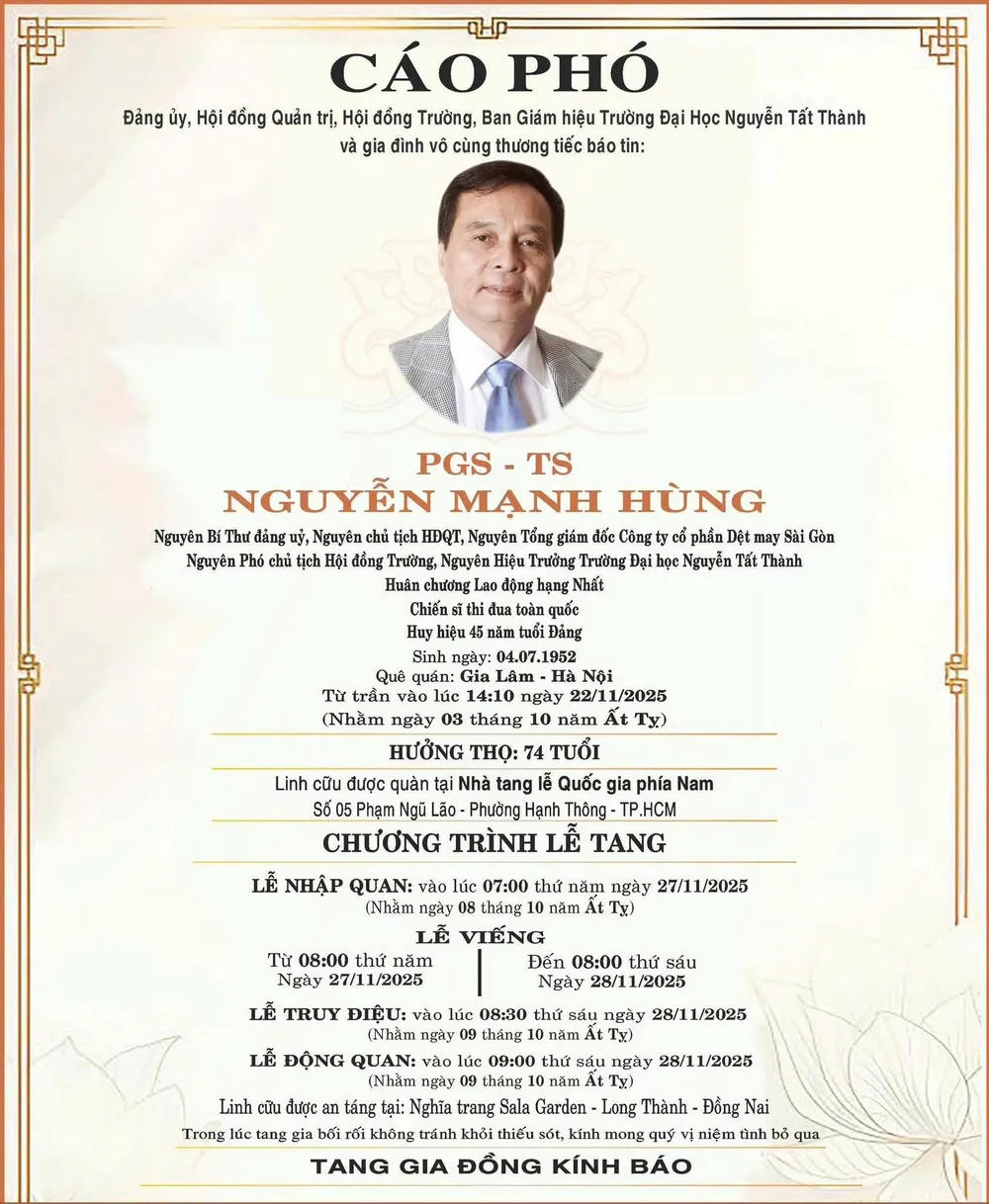 Theo thông báo, lễ viếng ông sẽ được Đảng ủy, Hội đồng quản trị Công ty cổ phần Dệt May Sài Gòn, Hội đồng trường, Ban Giám hiệu Trường ĐH Nguyễn Tất Thành cùng gia đình tổ chức từ 8 giờ ngày 27-11-2025 đến 8 giờ ngày 28-11-2025 tại Nhà tang lễ Quốc gia phía Nam (số 5 Phạm Ngũ Lão, phường Hạnh Thông, TP.HCM).