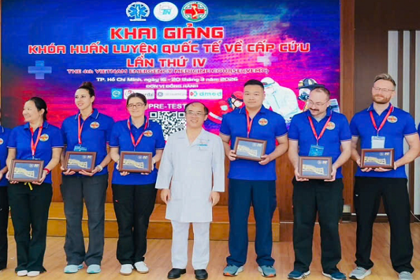 PGS-TS-BS Võ Thành Toàn (thứ 4 từ trái sang) trao giấy chứng nhận cho các học viên hoàn thành khóa huấn luyện quốc tế về cấp cứu