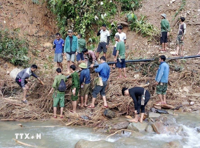 Người dân khuân vác đá để xếp mặt đường hiện đang bị phủ lớp bùn nhão, sình lầy tại các điểm sạt lở. (Ảnh: TTXVN phát)