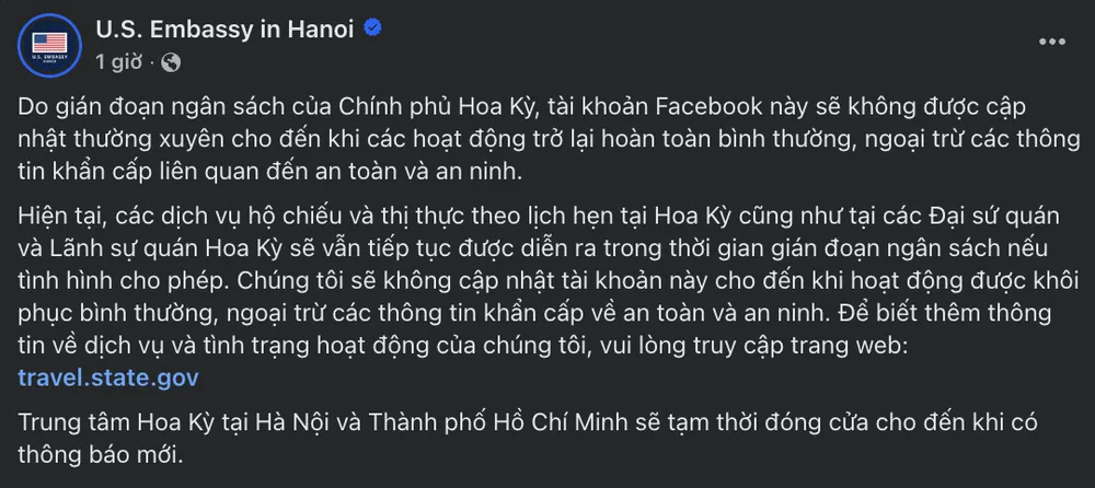 Trưa 1-10, phái bộ Mỹ tại Việt Nam cho biết do ảnh hưởng từ việc chính phủ Mỹ đóng cửa vì chưa đạt được thỏa thuận ngân sách, tài khoản Facebook chính thức của phái bộ này sẽ không được cập nhật thường xuyên cho đến khi các hoạt động trở lại bình thường.