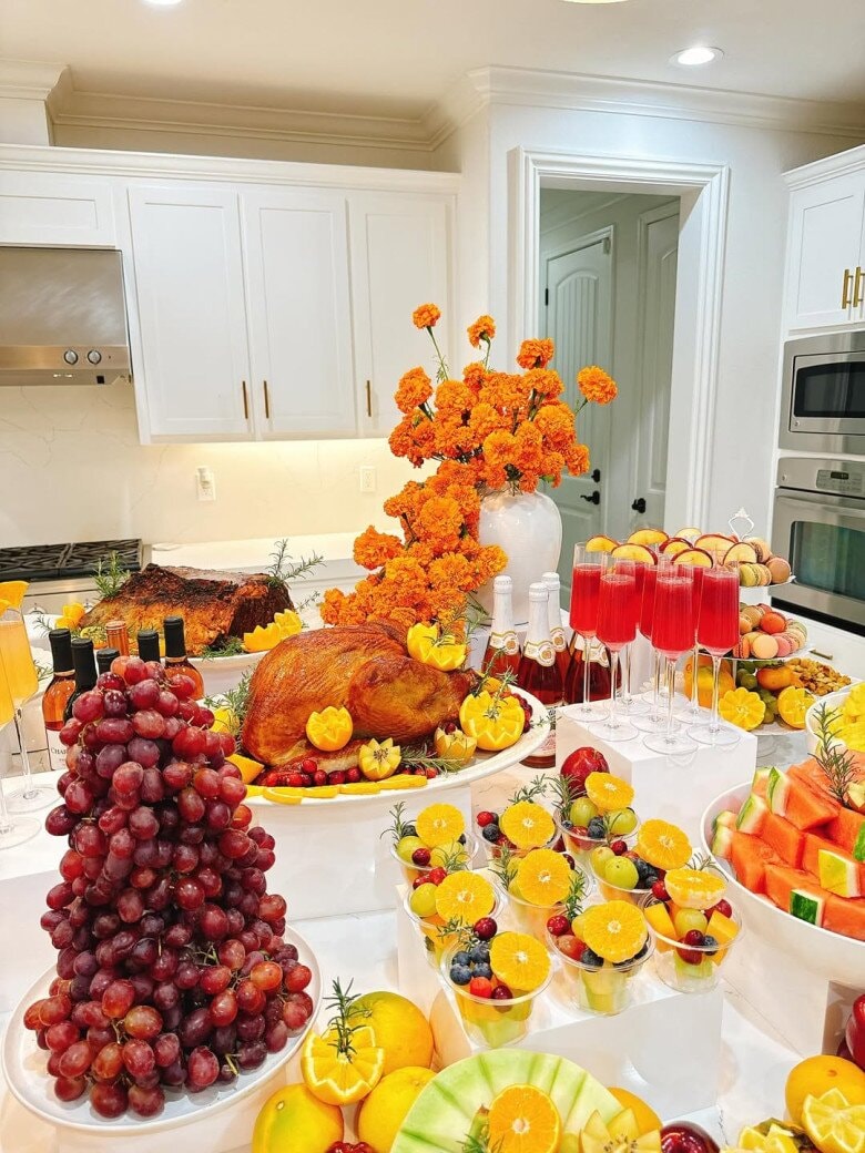 Bữa tiệc có đầy đủ các món ăn đặc trưng của ngày Lễ Tạ ơn, cùng với nhiều loại trái cây, bánh ngọt và rượu vang. Mọi chi tiết đều được bài trí tinh tế, cho thấy sự chu toàn và gu thẩm mỹ của chủ nhân.