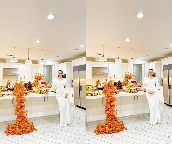 Tâm điểm của loạt ảnh là bàn tiệc được trang trí vô cùng công phu trong không gian bếp hiện đại với tông màu trắng chủ đạo. Một dải hoa tươi mang sắc cam rực rỡ được sắp xếp khéo léo theo hình thác đổ, uốn lượn từ mặt bàn xuống sàn nhà, tạo nên một điểm nhấn thị giác đầy ấn tượng.