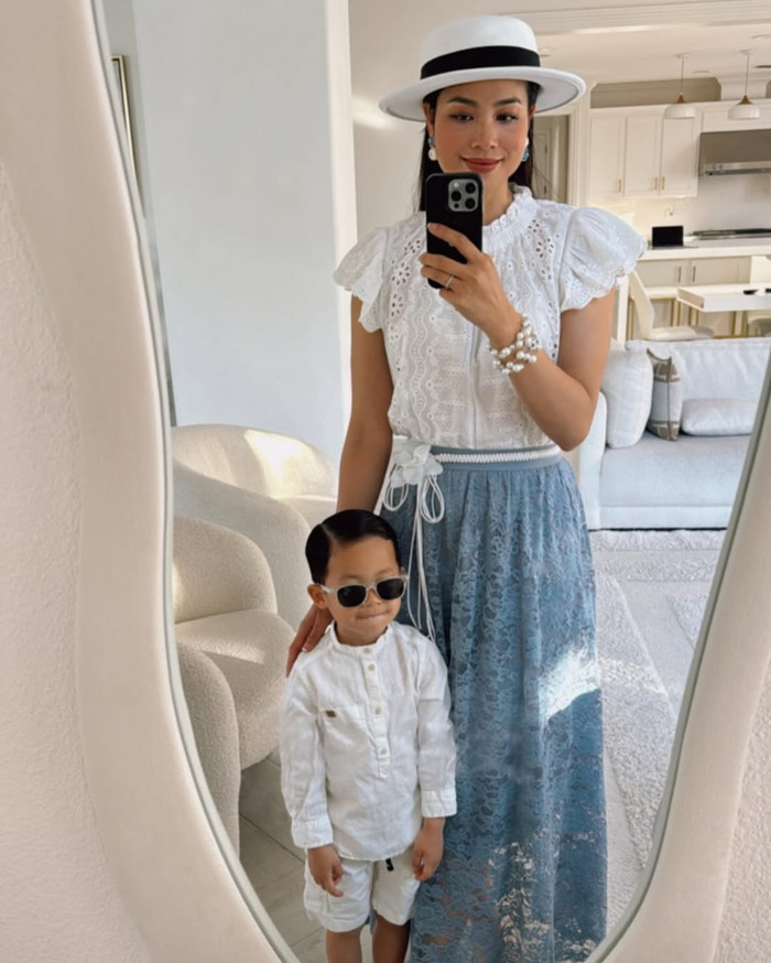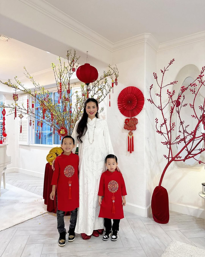 Bên cạnh việc bài trí biệt thự, Phạm Hương còn chuẩn bị áo dài cho hai con trai để chụp ảnh Tết tại nhà. Những bộ hình gia đình của cô luôn nhận được lượng tương tác lớn bởi sự đáng yêu của các bé cùng không gian được dàn dựng đẹp mắt. Hình ảnh các con diện áo dài truyền thống giữa khung cảnh trang trí đậm sắc xuân khiến nhiều khán giả không khỏi xuýt xoa.