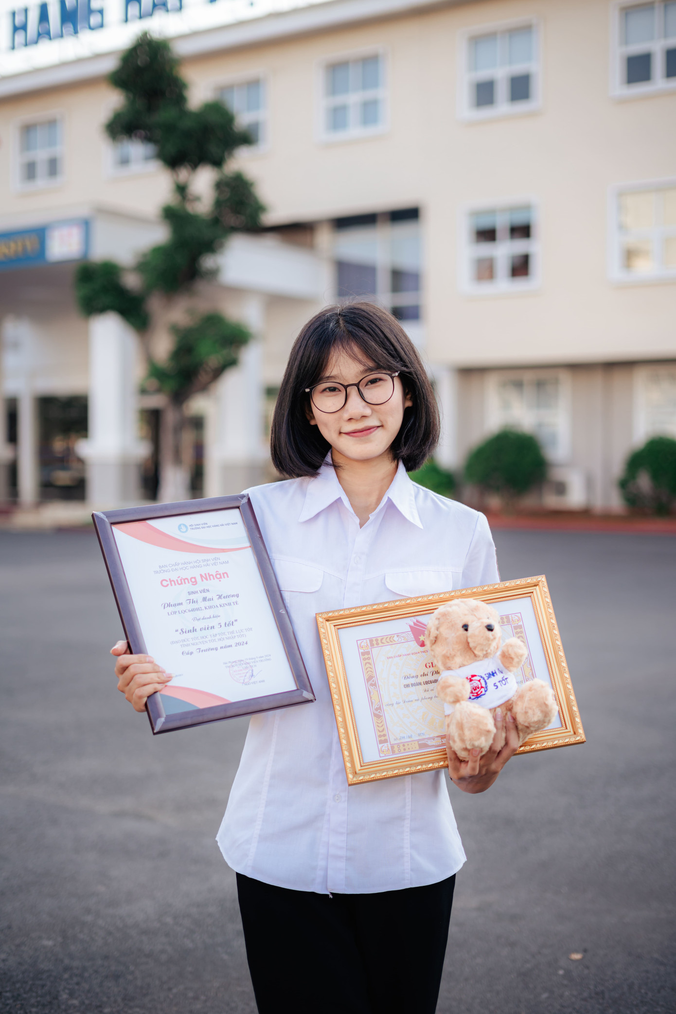 Khoảnh khắc Mai Hương rạng rỡ nhận danh hiệu “Sinh viên 5 Tốt” cấp Trường.