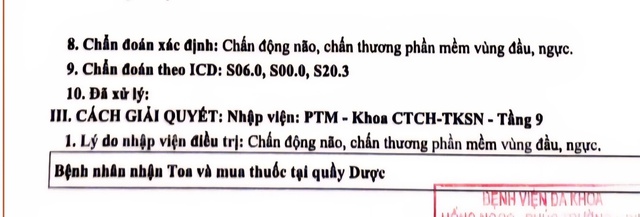Theo kết quả thăm khám ban đầu, bệnh viện chẩn đoán chị H. phải nhập viện vì bị chấn động não, chấn thương phần mềm vùng đầu và ngực.