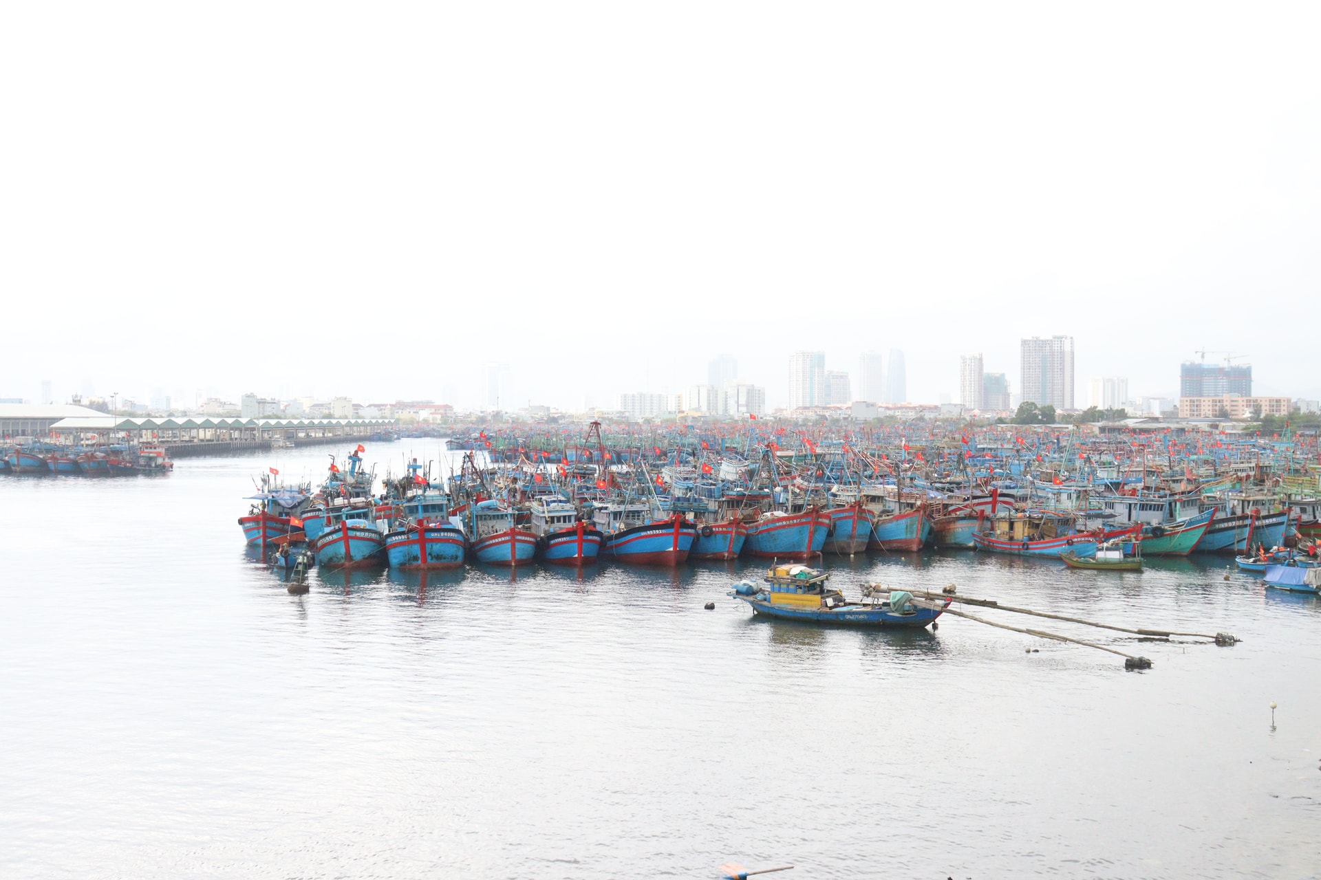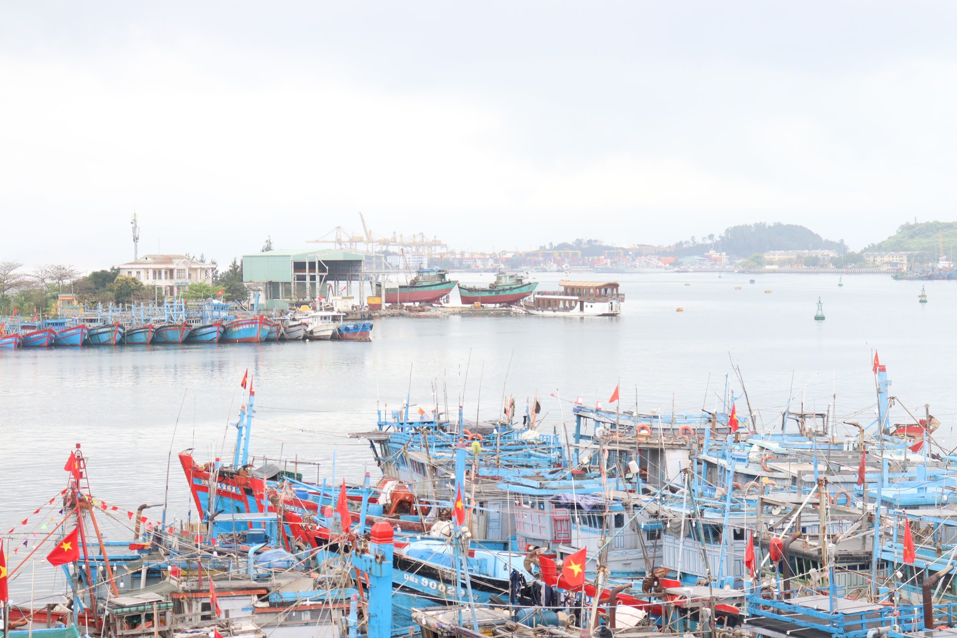 Nhiều tàu cá neo đậu ra bên ngoài vịnh Man Quang do âu thuyền và cảng cá Thọ Quang quá tải. Ảnh: HOÀNG HIỆP
