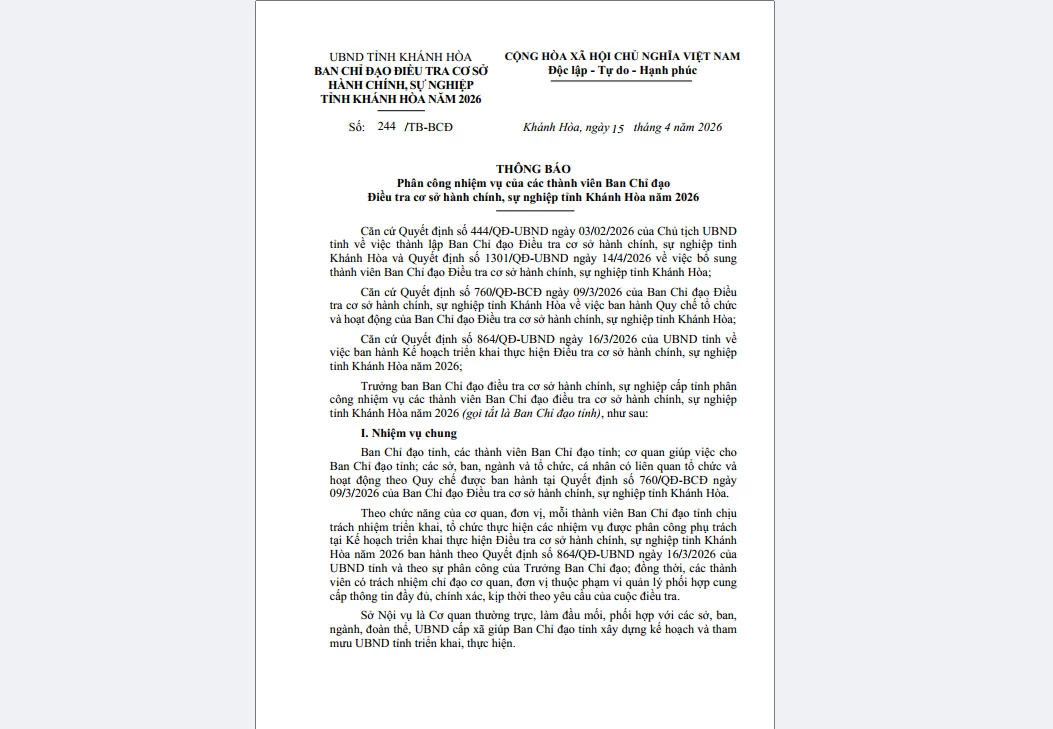 Theo đó, các thành viên ban chỉ đạo thực hiện nhiệm vụ theo kế hoạch điều tra cơ sở hành chính, sự nghiệp tỉnh Khánh Hòa năm 2026 và phân công của Trưởng Ban Chỉ đạo; chỉ đạo cơ quan, đơn vị thuộc phạm vi quản lý phối hợp cung cấp thông tin đầy đủ, chính xác, kịp thời theo yêu cầu của cuộc điều tra. Sở Nội vụ là cơ quan thường trực, phối hợp giúp Ban Chỉ đạo xây dựng kế hoạch và tham mưu UBND tỉnh triển khai.