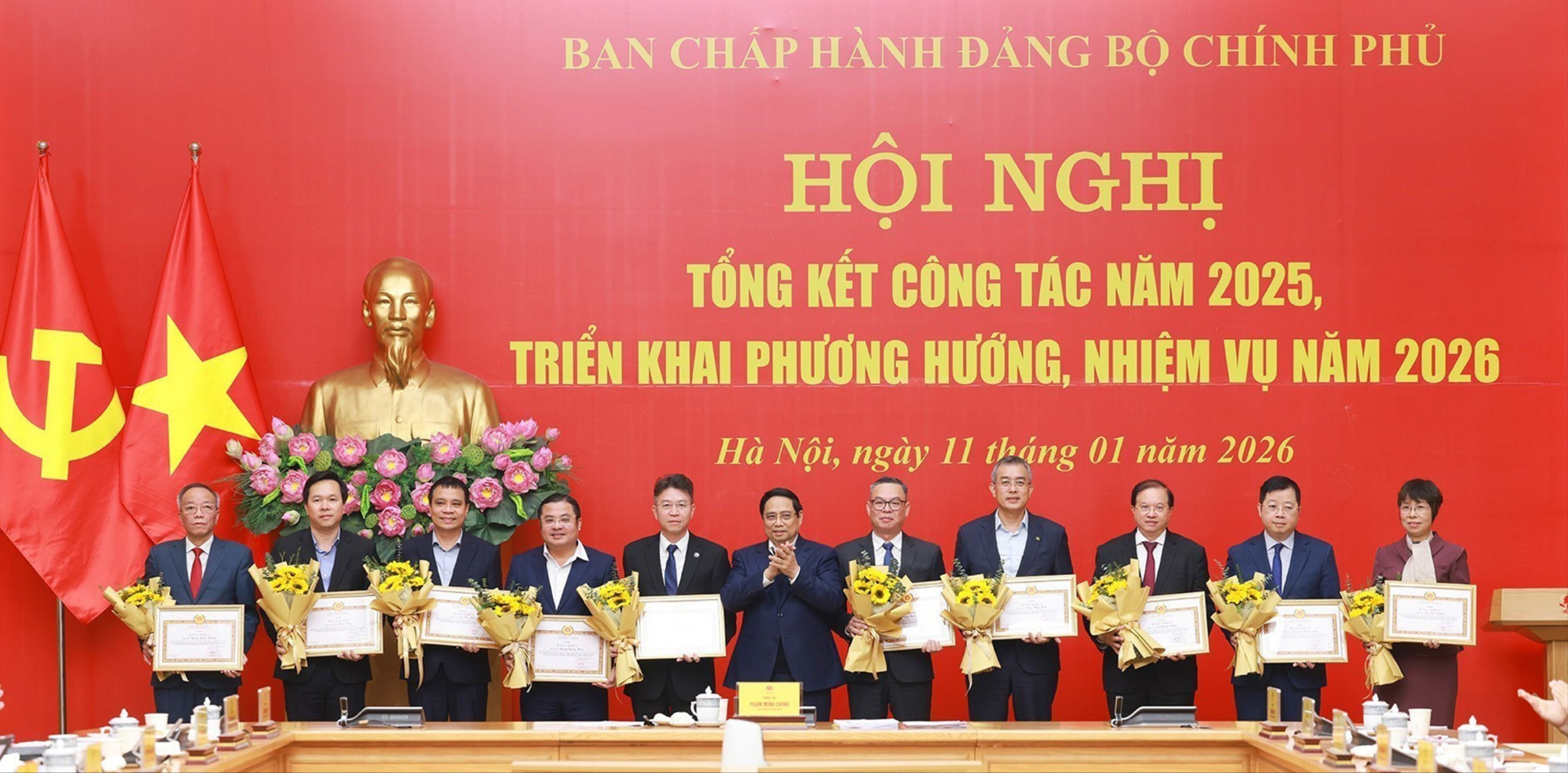 Tại hội nghị, thay mặt Ban Thường vụ Đảng ủy Chính phủ, Bí thư Đảng ủy Chính phủ, Thủ tướng Phạm Minh Chính trao bằng khen của Đảng ủy Chính phủ tặng các tổ chức đảng và cán bộ, đảng viên có thành tích trong lãnh đạo, chỉ đạo tổ chức Đại hội Đảng bộ Chính phủ; hoàn thành xuất sắc nhiệm vụ tiêu biểu; hoàn thành xuất sắc trong công tác lãnh đạo nhiệm vụ chính trị năm 2025.