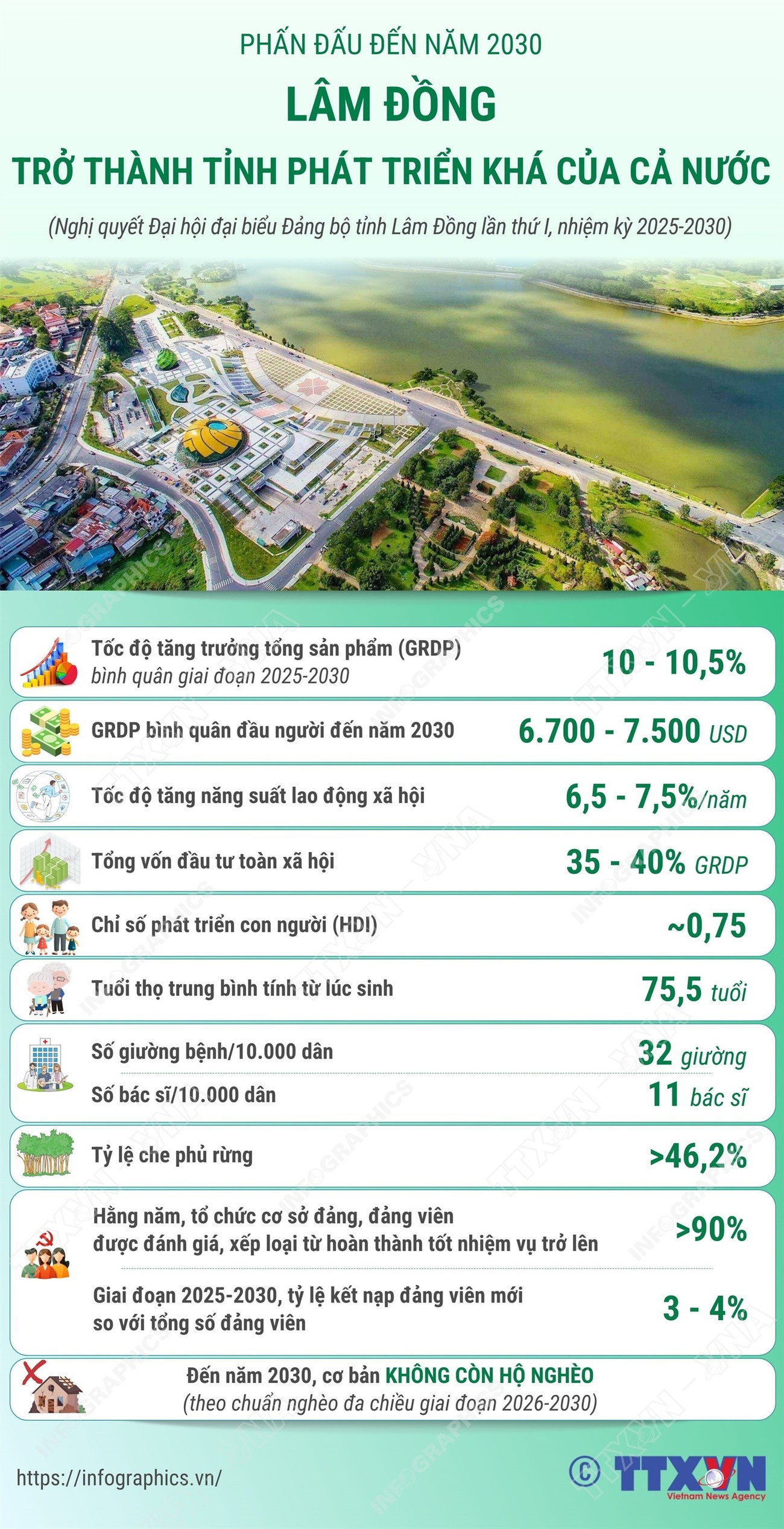 Đến năm 2030, GRDP bình quân đầu người đạt từ 6.700-7.500 USD, tổng vốn đầu tư toàn xã hội chiếm 35-40% GRDP. Chỉ số phát triển con người (HDI) phấn đấu đạt khoảng 0,75; đến năm 2030 (theo chuẩn nghèo đa chiều giai đoạn 2026-2030) cơ bản không còn hộ nghèo./.