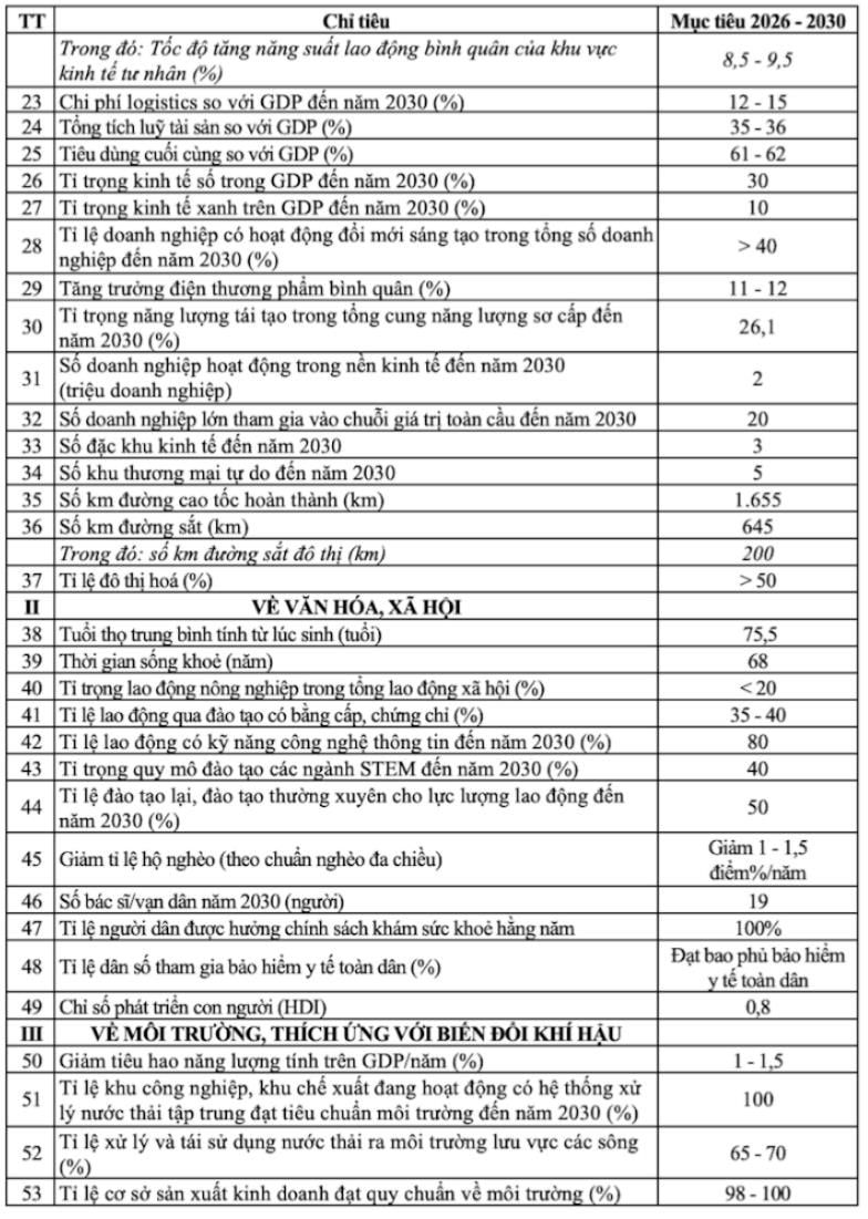 Phụ lục các chỉ tiêu kinh tế - xã hội giai đoạn 2026-2030 tại Nghị quyết về kế hoạch phát triển kinh tế - xã hội 5 năm.