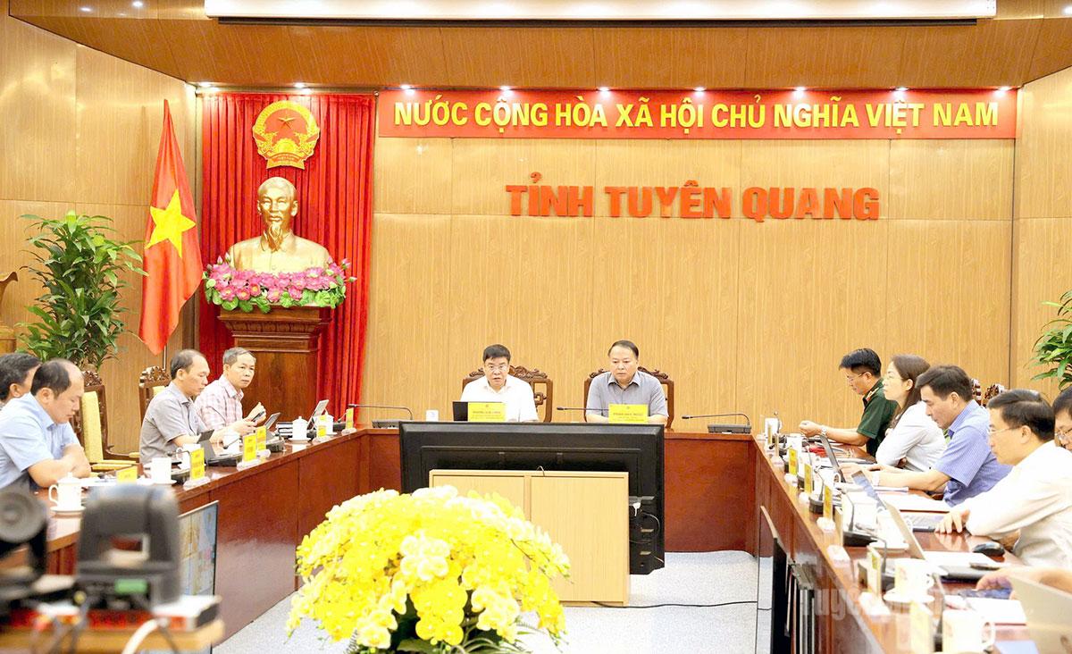 Các đồng chí: Phan Huy Ngọc, Phó Bí thư Tỉnh ủy, Chủ tịch UBND tỉnh; Hoàng Gia Long, Ủy viên BTV Tỉnh ủy, Phó Chủ tịch UBND tỉnh chủ trì hội nghị tại điểm cầu Tuyên Quang.
