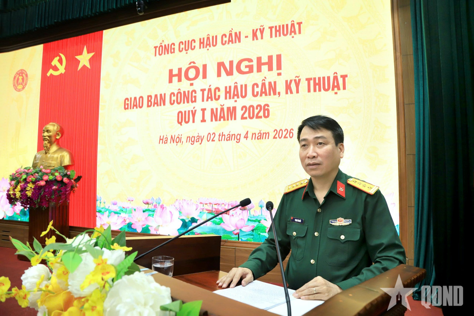 Đại tá Phạm Văn Hiểu, Cục trưởng Cục Hậu cần-Kỹ thuật (Tổng cục Hậu cần-Kỹ thuật) báo cáo kết quả thực hiện nhiệm vụ quý I-2026.
