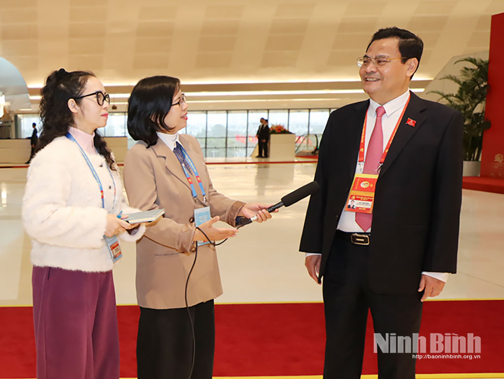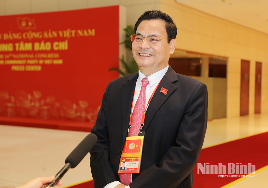 Phóng viên: Thưa đồng chí! Là đại biểu của Đảng bộ tỉnh Ninh Bình tham dự Đại hội đại biểu lần thứ XIV của Đảng, sau khi nghiên cứu, nghe và thảo luận các dự thảo văn kiện trình tại Đại hội, xin đồng chí cho biết, những điểm mới trong Văn kiện Đại hội XIV của Đảng so với Văn kiện kỳ Đại hội trước và những nội dung tâm đắc trong Báo cáo chính trị?