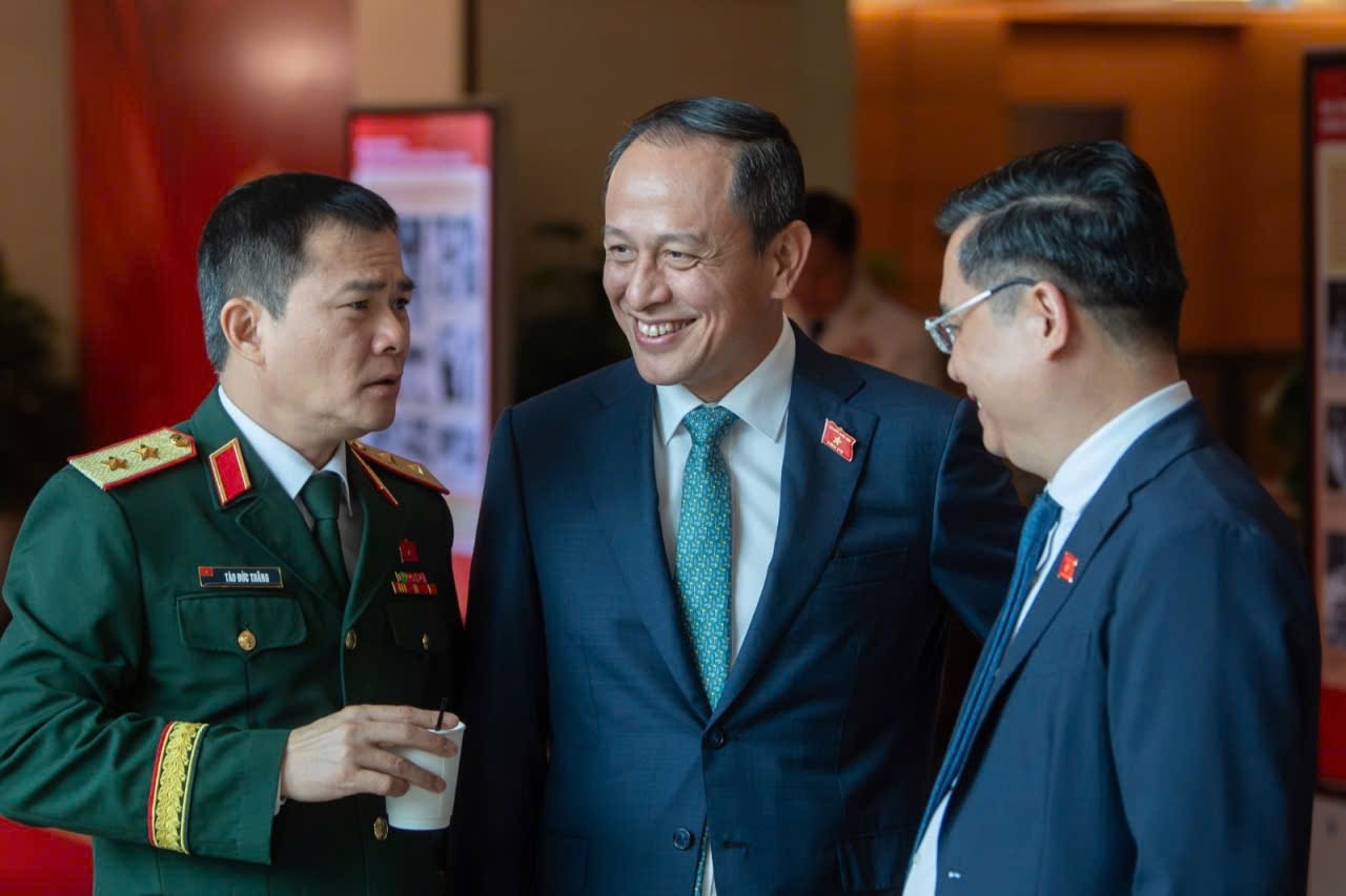 Đại biểu Quốc hội Lê Hồng Hà (ở giữa) trao đổi với các đại biểu bên hành lang kỳ họp. Ảnh BN