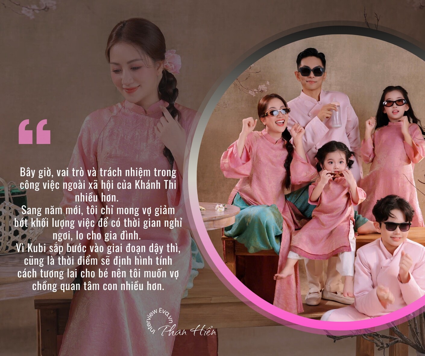 Chia sẻ về cuộc sống gia đình, Phan Hiển dành lời khen tuyệt đối cho Khánh Thi trong vai trò làm dâu. Dù là người Hà Nội làm dâu trong gia đình gốc Nam, Khánh Thi đã khéo léo gắn kết các thành viên suốt hơn 10 năm. Nam kiện tướng thừa nhận đôi khi cảm thấy "vô dụng" vì bà xã quá đảm đang, từ việc đối nội đối ngoại đến trang hoàng nhà cửa mỗi dịp Tết đến xuân về.