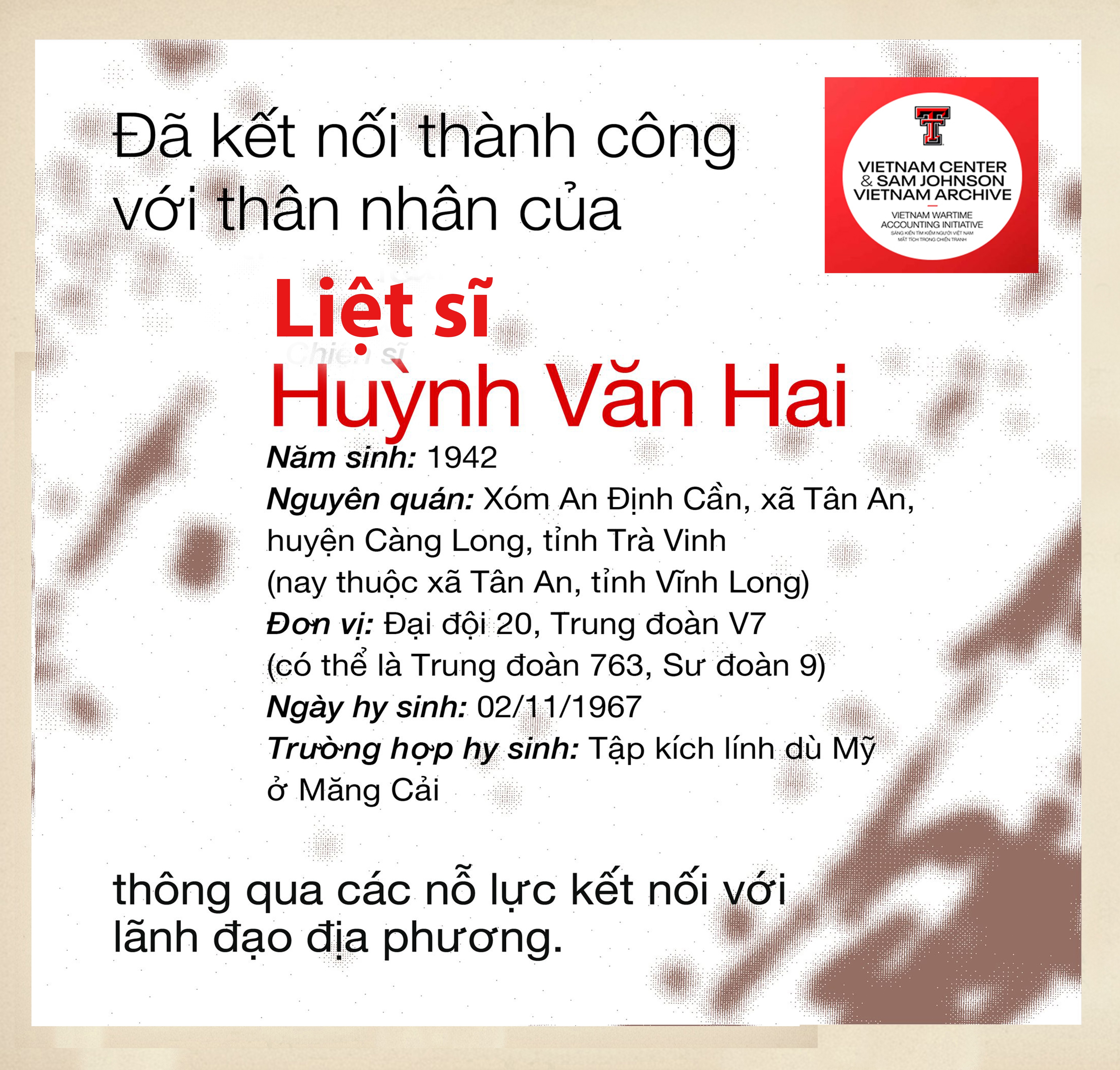 Điều đáng trân trọng là ngay sau khi thông tin được lan tỏa, Nhóm Gắn kết cộng đồng & Lịch sử truyền khẩu của TTU-VWAI đã nhanh chóng vào cuộc. Bằng sự kiên trì và trách nhiệm, nhóm đã tiến hành nhiều ngày liên hệ với chính quyền địa phương từ cấp xã đến cấp tỉnh. Cuối cùng, họ đã tìm được thân nhân của liệt sĩ Huỳnh Văn Hai – một kết quả không chỉ mang ý nghĩa thông tin, mà còn là sự hồi sinh của ký ức gia đình sau nhiều năm đứt đoạn.