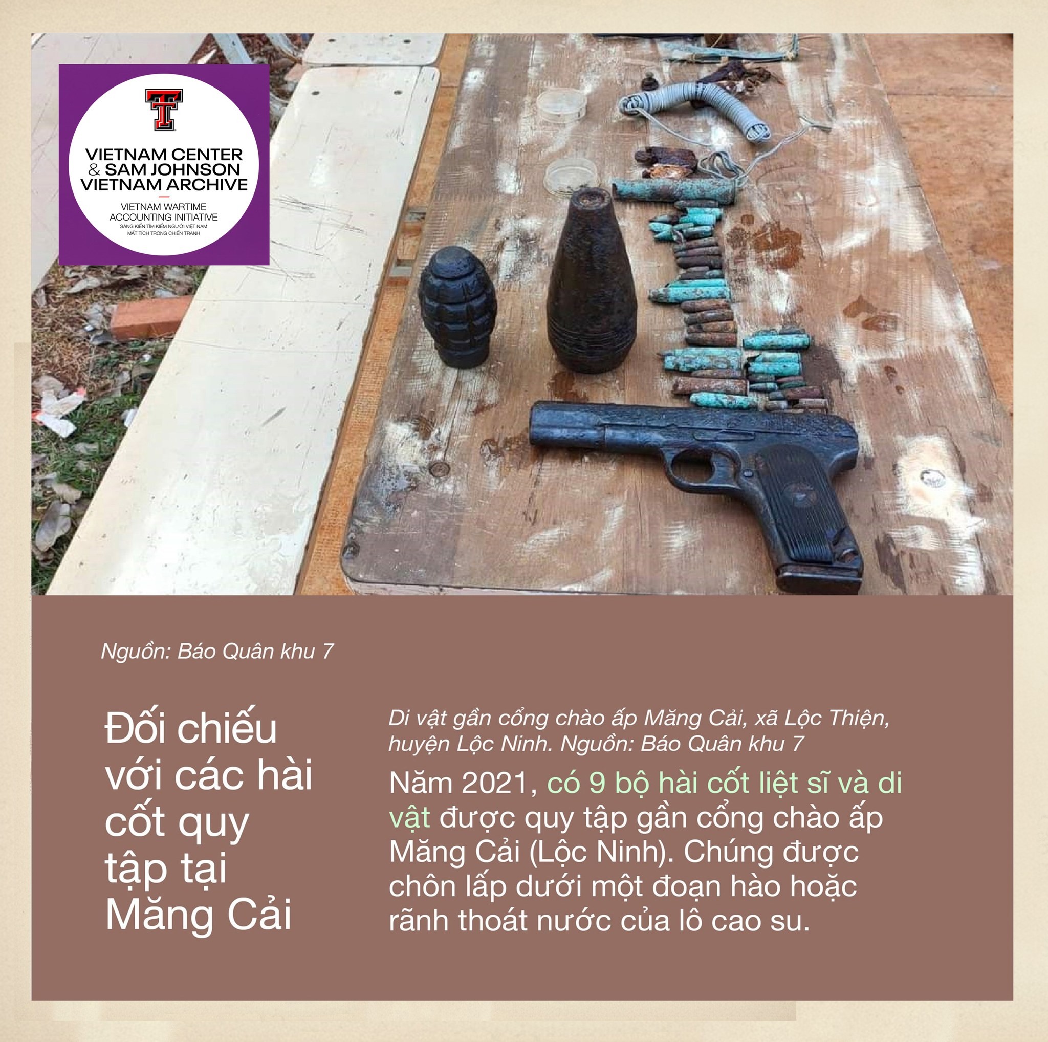 Hành trình chưa dừng lại ở đó. Dự án tiếp tục lần theo các dấu vết lịch sử và phát hiện một thông tin quan trọng: vào năm 2021, tại khu vực gần cổng chào ấp Măng Cải, xã Lộc Thiện, huyện Lộc Ninh, đội K72 đã quy tập được 9 bộ hài cốt liệt sĩ. Các hài cốt này được tìm thấy dưới một đoạn hào hoặc rãnh thoát nước trong lô cao su – nơi từng là chiến trường khốc liệt năm xưa.