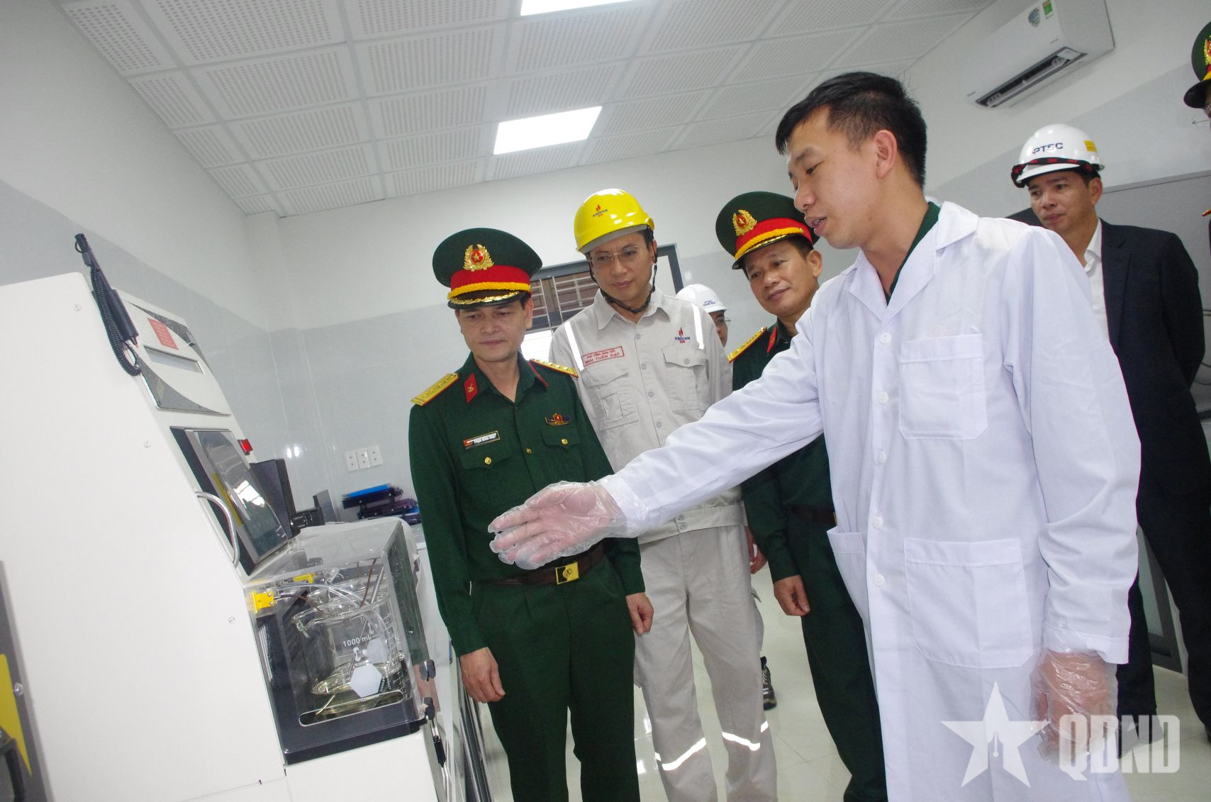 Cán bộ phòng xét nghiệm Phân kho 85 giới thiệu quy trình kiểm tra, đánh giá chất lượng xăng, dầu của đơn vị.