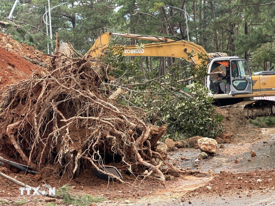 Nhiều cây thông cổ thụ ngã đổ xuống mặt đường đèo Prenn trưa 4/12/2025. (Ảnh: Chu Quốc Hùng/TTXVN)