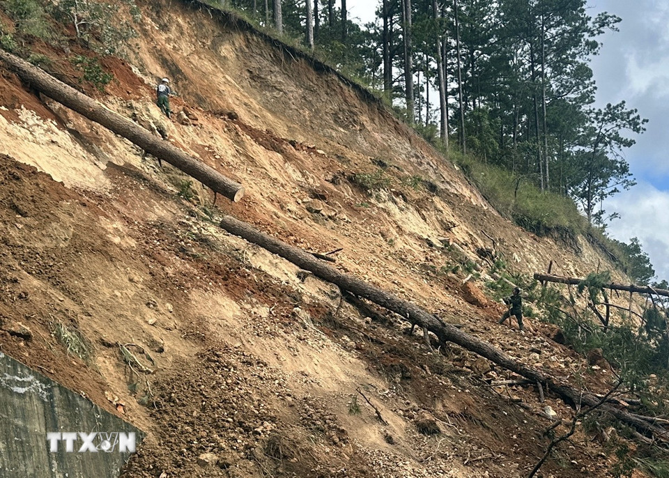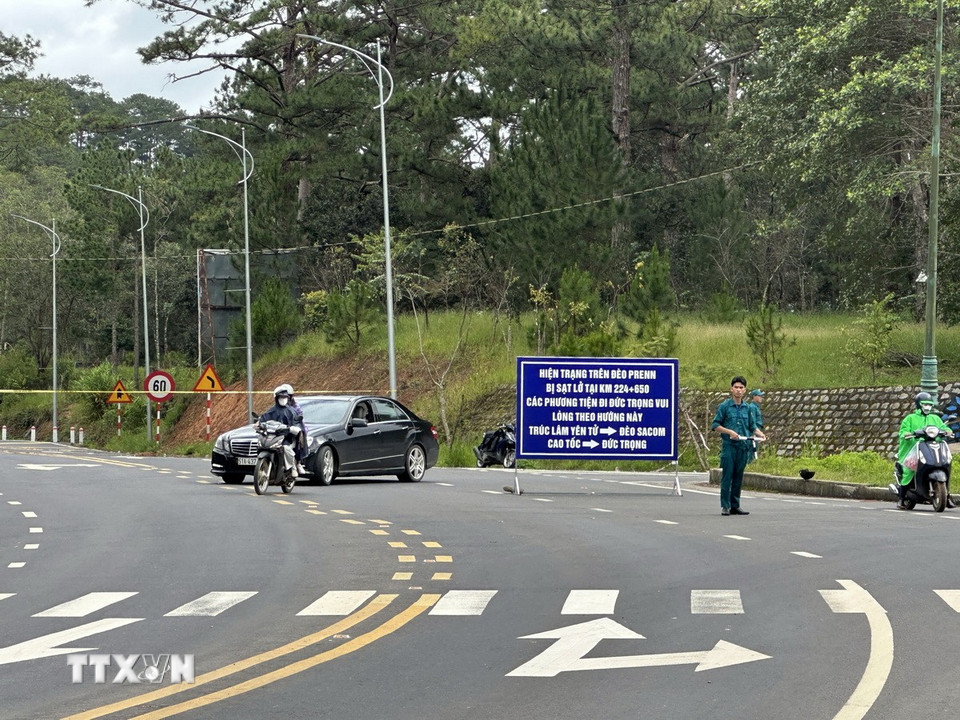 Một vị trí khác trên đèo Prenn bị sạt lở, được cơ quan chức năng phân luồng, xử lý. (Ảnh: Chu Quốc Hùng/TTXVN)