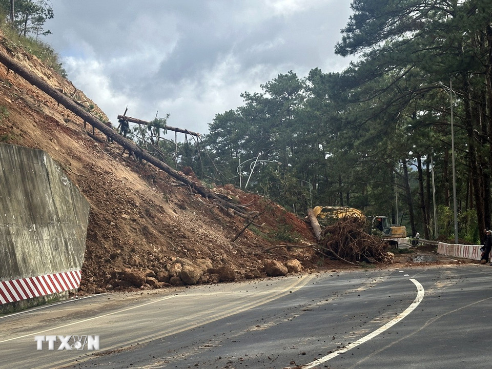 Đèo Prenn, cửa ngõ chính vào Đà Lạt, bị sạt lở nghiêm trọng giữa trưa 4/12/2025. (Ảnh: Chu Quốc Hùng/TTXVN)