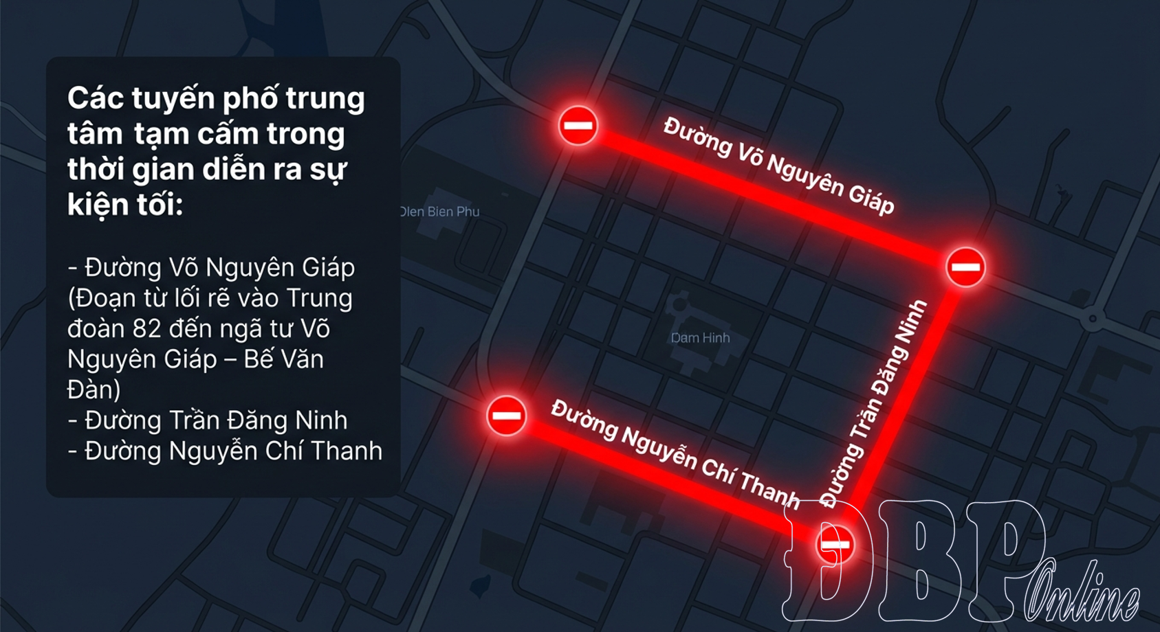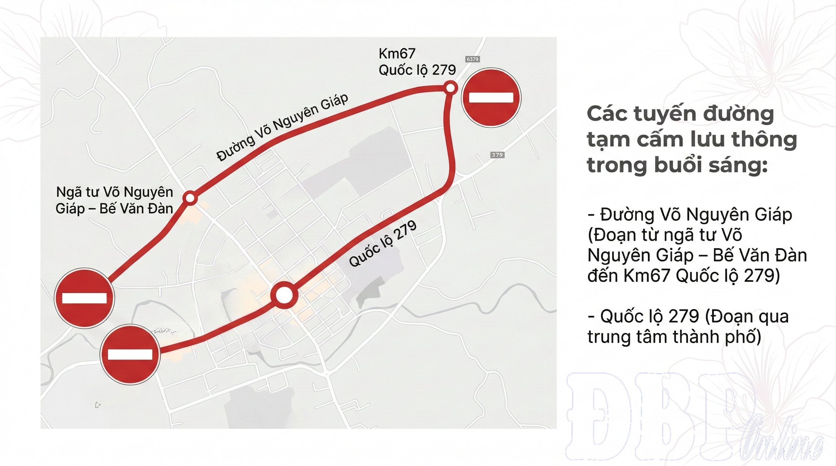 Theo kế hoạch, Giải đua xe đạp và Giải Việt dã “Về Điện Biên Phủ mở rộng” sẽ diễn ra vào sáng 7/3. Trong thời gian này, lực lượng chức năng tổ chức cấm tất cả các loại phương tiện (trừ vận động viên tham gia giải, phương tiện của ban tổ chức và các xe ưu tiên theo quy định) lưu thông trên tuyến đường Võ Nguyên Giáp và quốc lộ 279, đoạn từ ngã tư Võ Nguyên Giáp – Bế Văn Đàn đến km67 quốc lộ 279. Thời gian cấm đường từ 6 giờ đến khi kết thúc chương trình (dự kiến khoảng 10 giờ cùng ngày).
