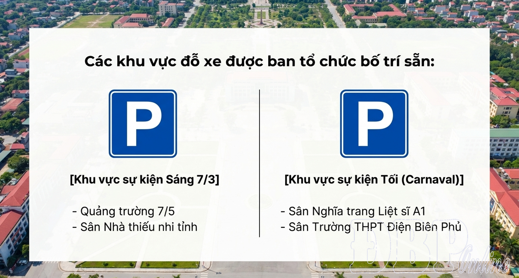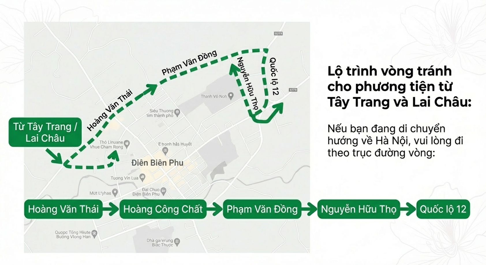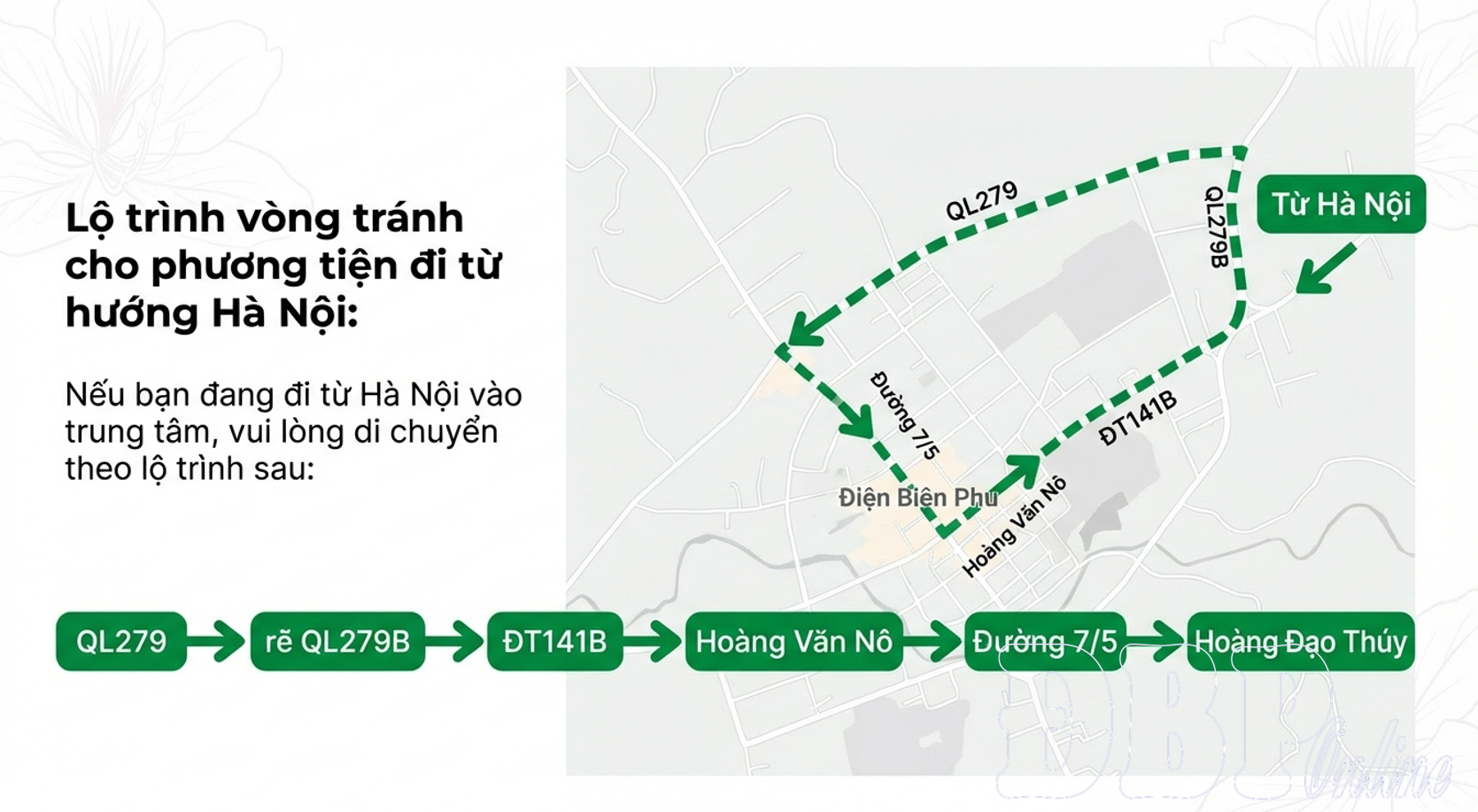 Để bảo đảm giao thông thông suốt, các phương tiện sẽ được điều tiết lưu thông theo nhiều hướng thay thế. Cụ thể, phương tiện hướng từ Hà Nội vào trung tâm di chuyển theo quốc lộ 279 đến khu vực ngã ba giao với quốc lộ 279B (lối rẽ vào xã Mường Phăng), sau đó đi theo tuyến đường tỉnh 141B, đường Hoàng Văn Nô, đường 7/5 và đường Hoàng Đạo Thúy. Các phương tiện từ hướng Tây Trang hoặc Lai Châu đi Hà Nội được hướng dẫn lưu thông theo các tuyến: Hoàng Văn Thái, Hoàng Công Chất, Phạm Văn Đồng, Nguyễn Hữu Thọ và quốc lộ 12.