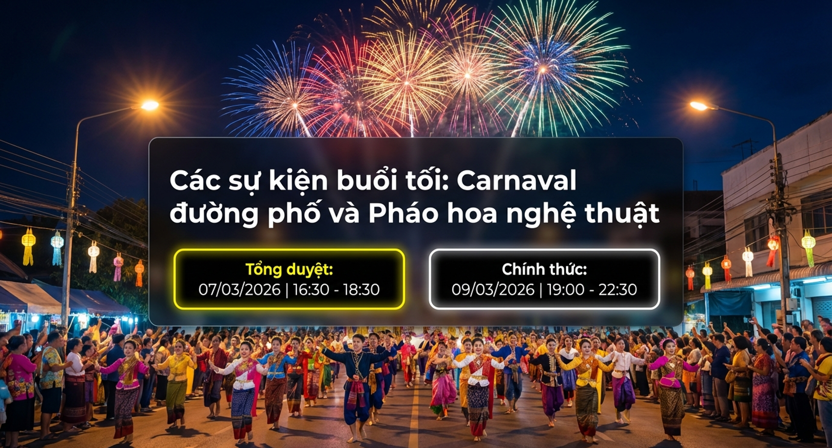 Bên cạnh đó, chương trình Carnaval đường phố kết hợp bắn pháo hoa trong khuôn khổ lễ hội cũng sẽ thực hiện cấm đường tại một số tuyến phố trung tâm. Cụ thể, chương trình tổng duyệt diễn ra từ 16 giờ 30 đến khoảng 18 giờ 30 ngày 7/3, chương trình chính thức từ 19 giờ đến khoảng 22 giờ 30 ngày 9/3. Các tuyến đường cấm gồm: Đường Võ Nguyên Giáp (đoạn từ lối rẽ vào Trung đoàn 82 đến ngã tư Võ Nguyên Giáp – Bế Văn Đàn), đường Trần Đăng Ninh và đường Nguyễn Chí Thanh.