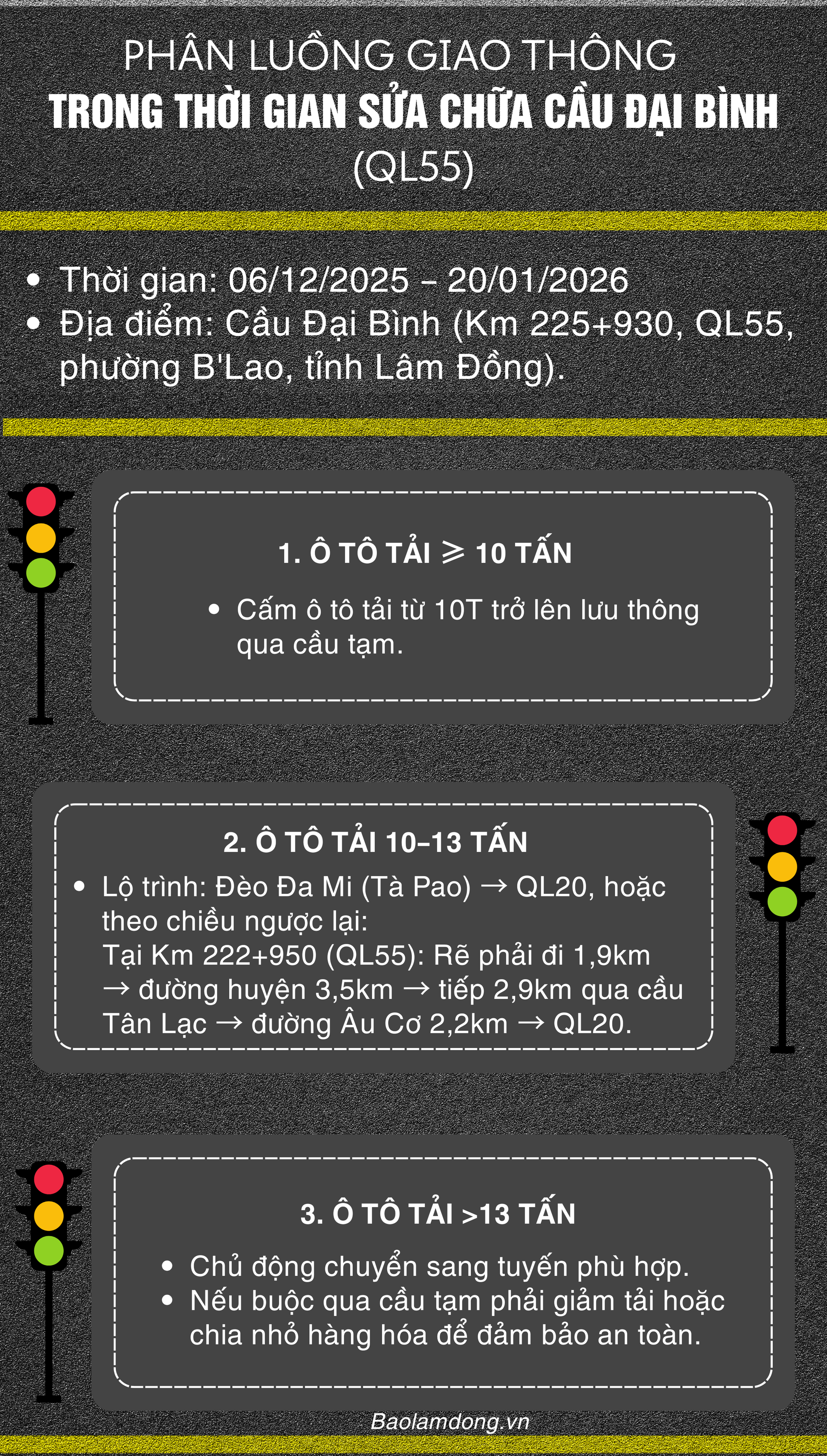 Sở Xây dựng đề nghị Phòng Cảnh sát giao thông Công an tỉnh, UBND phường B'Lao hỗ trợ bố trí lực lượng thường xuyên tuần tra, kiểm soát, đảm bảo giao thông được thông suốt, an toàn trong thời gian thi công sửa chữa cầu; Ban Quản lý bảo trì đường bộ Lâm Đồng, các đơn vị thi công chịu trách nhiệm tổ chức lắp đặt đầy đủ hệ thống báo hiệu đường bộ theo đúng phương án tổ chức giao thông và quy định hiện hành trong quá trình thi công sửa chữa cầu.