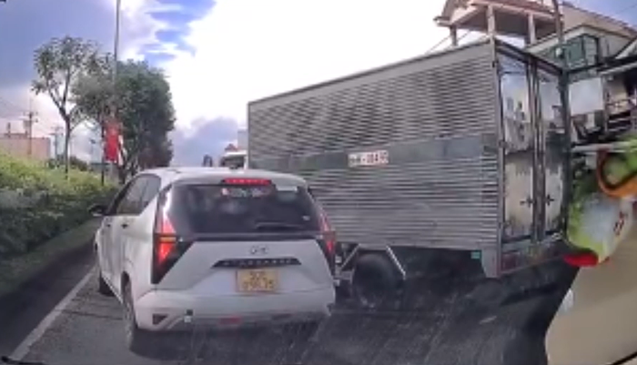 Chiếc xe tải vượt lên, chèn ép đầu ô tô đang lưu thông cùng chiều. Ảnh cắt từ clip. (Nguồn: Báp Pháp luật TP.HCM)