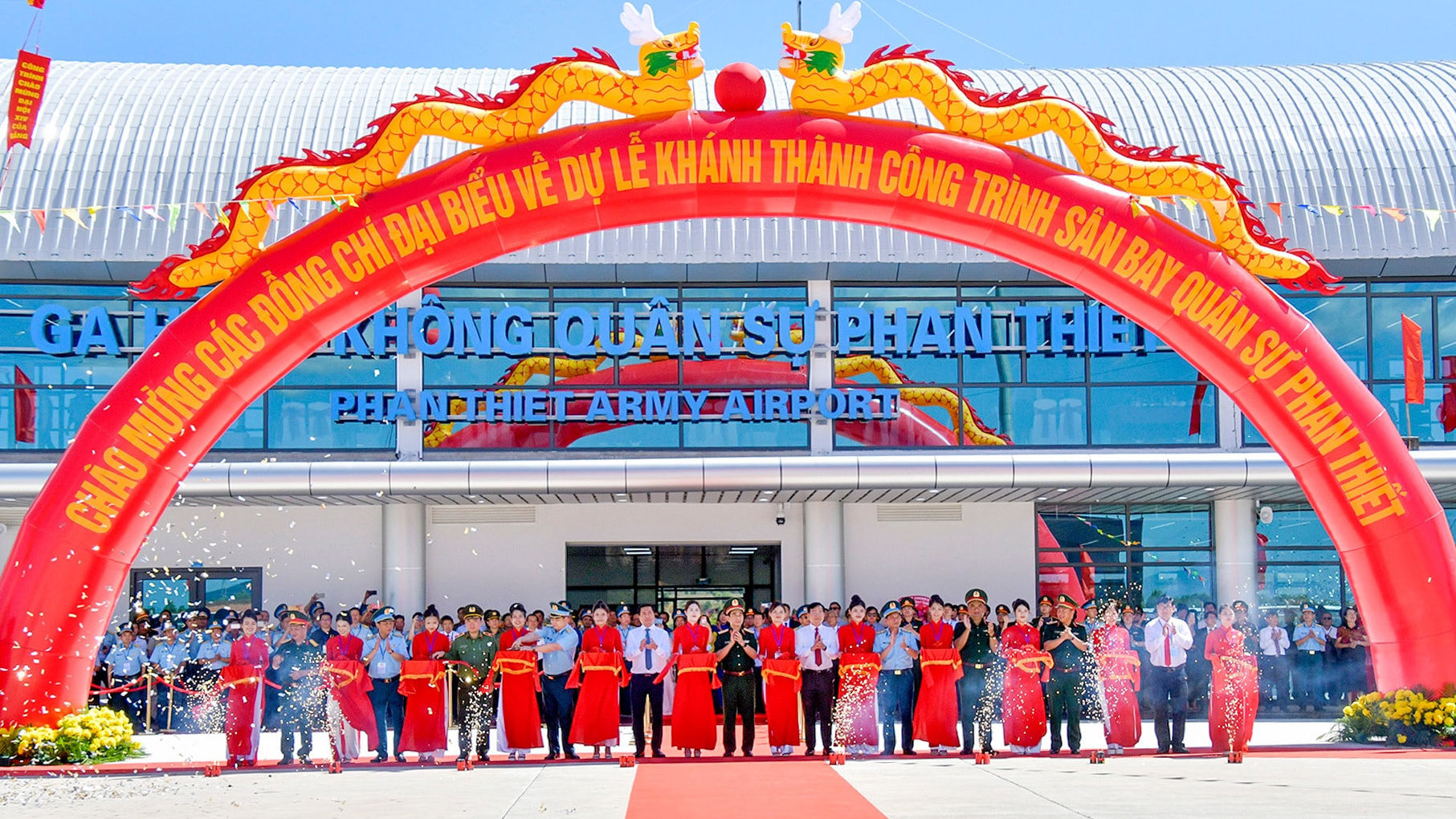 Các đại biểu thực hiện nghi thức cắt băng khánh thành dự án Sân bay Quân sự Phan Thiết vào tháng 12/2025
