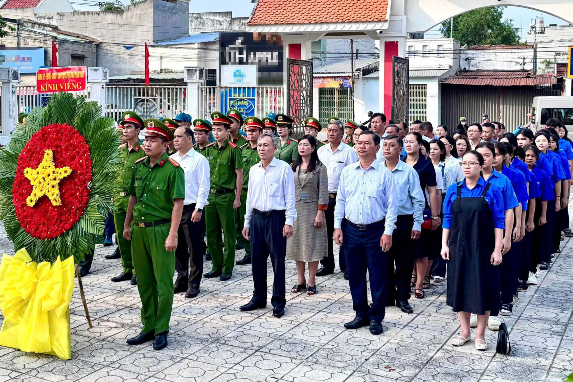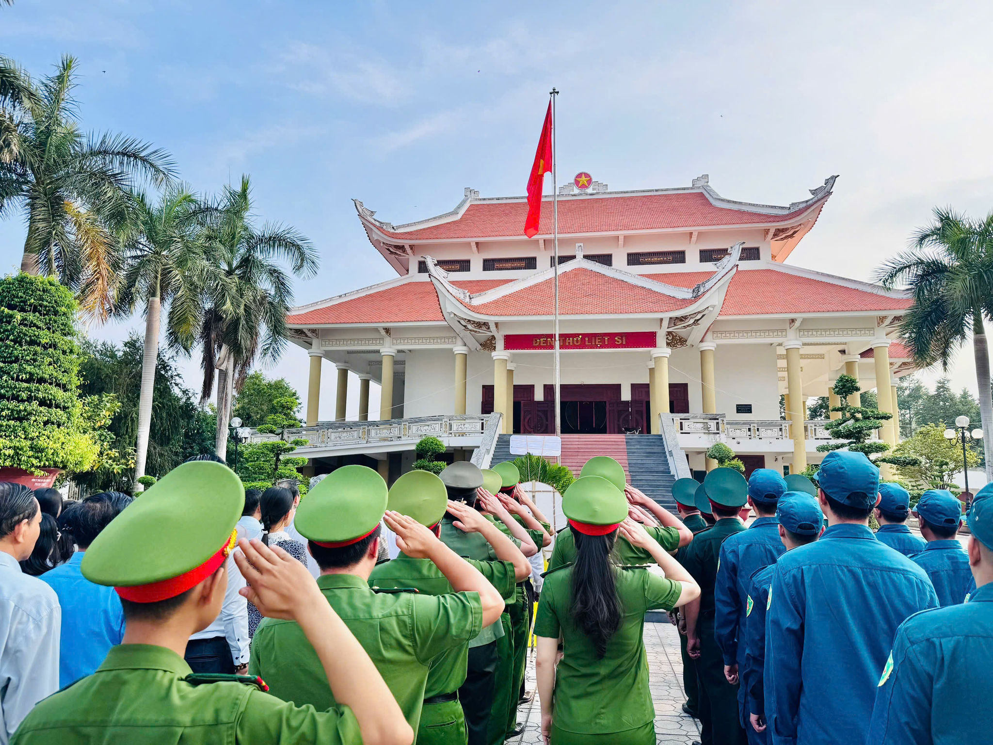 Đông đảo các lực lượng vũ trang tại địa phương tham gia lễ dâng hương tại đền thờ liệt sĩ (Ảnh: Hoàng Giang)