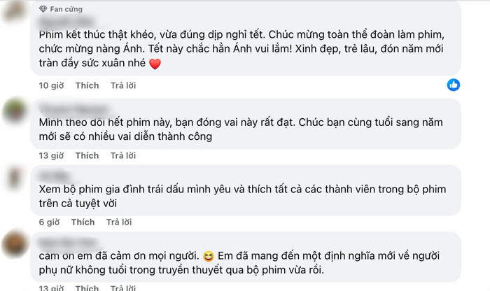 Bên cạnh những lời khen, khán giả cũng bày tỏ sự tiếc nuối khi bộ phim khép lại, đồng thời nhắc đến vai diễn của Kiều Anh như một điểm nhấn đáng nhớ. Một bình luận ngắn gọn viết: "Buồn quá thế là hết được xem phim rồi". Một ý kiến khác nhận xét cái kết của phim để lại nhiều cảm xúc: "Phim kết thúc thật khéo, vừa đúng dịp nghỉ Tết".