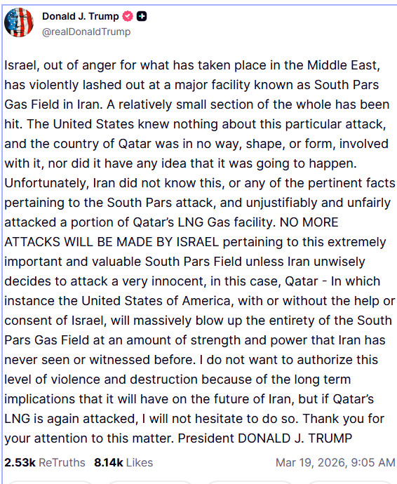 Tổng thống Donald Trump nêu rõ Israel sẽ không tiếp tục thực hiện các cuộc tấn công nhằm vào mỏ khí đốt South Pars - một cơ sở năng lượng quan trọng trừ khi Iran có hành động quân sự nhằm vào các quốc gia khác trong khu vực, trong đó có Qatar.
