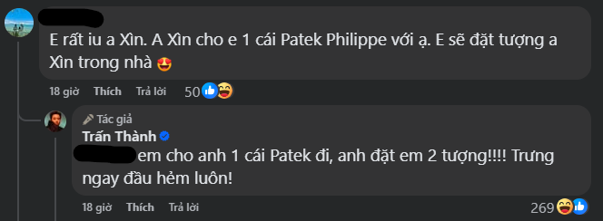 Cụ thể, một người hâm mộ để lại bình luận dưới bài đăng của Trấn Thành gần đây: "Em rất yêu anh Xìn. Anh Xìn cho em 1 cái Patek Philippe với ạ. Em sẽ đặt tượng anh Xìn trong nhà". Ngay lập tức, Trấn Thành phản hồi một cách dí dỏm: "Em cho anh 1 cái Patek đi, anh đặt em 2 tượng! Trưng ngay đầu hẻm luôn!".