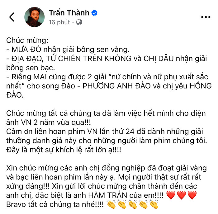 Bài đăng của Trấn Thành không chỉ thể hiện niềm vui cá nhân mà còn gửi lời tri ân tới những người đồng nghiệp đã cống hiến cho điện ảnh Việt Nam. Anh nhấn mạnh: "Xin gửi lời chúc mừng chân thành đến các anh chị, hoan hô tất cả chúng ta nhé!". Đi kèm là những biểu tượng cảm xúc trái tim và vỗ tay, thể hiện sự nhiệt huyết và gắn kết với cộng đồng làm phim.