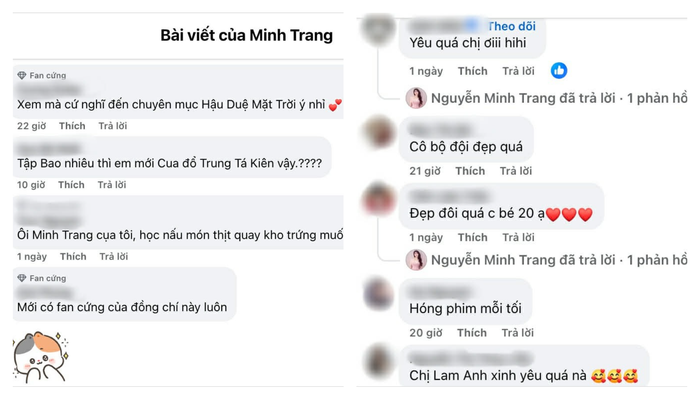 Bên dưới bài đăng, nhiều khán giả bày tỏ sự thích thú trước tạo hình quân nhân của hai diễn viên. Một tài khoản nhận xét: "Cô bộ đội đẹp quá", trong khi một ý kiến khác viết: "Đẹp đôi quá chị ơi", kèm theo nhiều biểu tượng cảm xúc thể hiện sự yêu thích. Không ít người cho biết họ theo dõi bộ phim đều đặn mỗi tối, như bình luận: "Hóng phim mỗi tối".