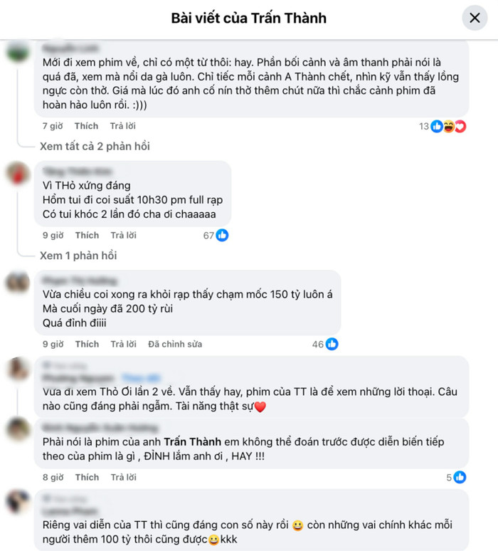 Việc Trấn Thành nhanh chóng chạm mốc 200 tỷ đồng chỉ sau 5 ngày công chiếu vì thế không chỉ được nhìn nhận như một thành tích doanh thu đơn thuần. Trên mạng xã hội, bên cạnh những lời chúc mừng, vẫn tồn tại các góp ý chi tiết, tranh luận về kỹ thuật và cảm xúc phim, cho thấy Thỏ Ơi!! đã kích hoạt cuộc đối thoại thực sự giữa tác phẩm và công chúng, thay vì chỉ dừng ở hiệu ứng "xem cho biết" trong mùa Tết.