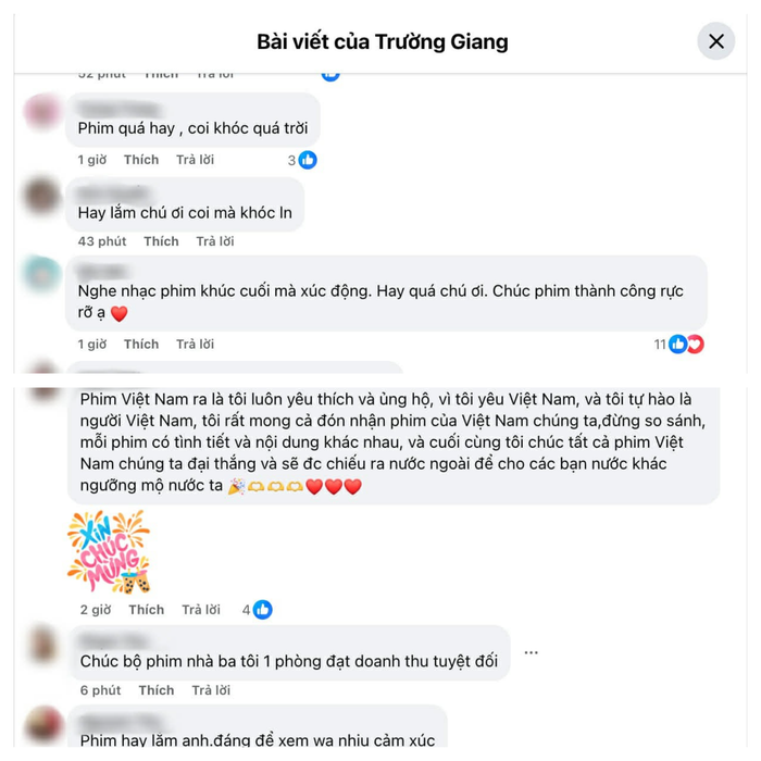 Trên trang cá nhân, Trường Giang đăng tải bài viết chia sẻ thành tích bước đầu của phim, đồng thời gửi lời cảm ơn tới người xem đã dành thời gian ra rạp ủng hộ. Bên dưới bài đăng, hàng loạt bình luận được để lại, phần nào phản ánh rõ phản ứng và cảm xúc của khán giả dành cho tác phẩm điện ảnh đầu tay do anh làm đạo diễn kiêm nhà sản xuất và đóng chính.