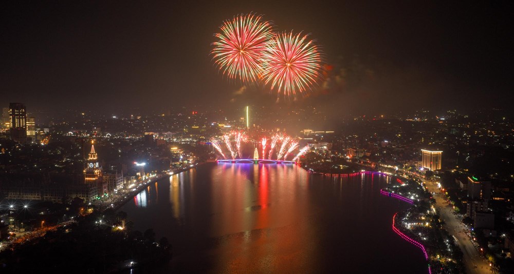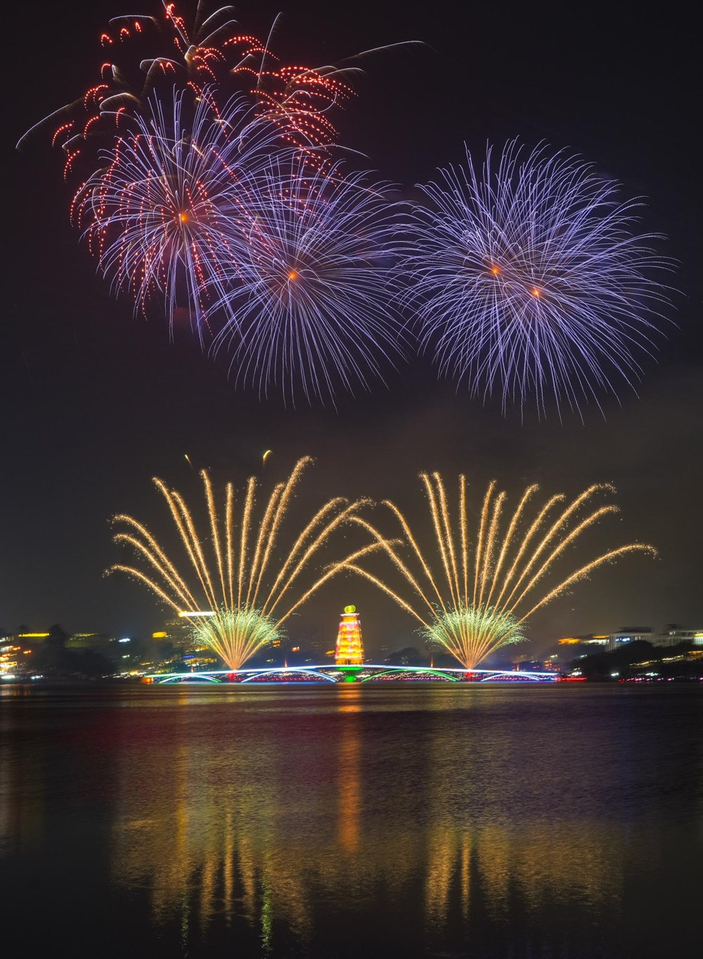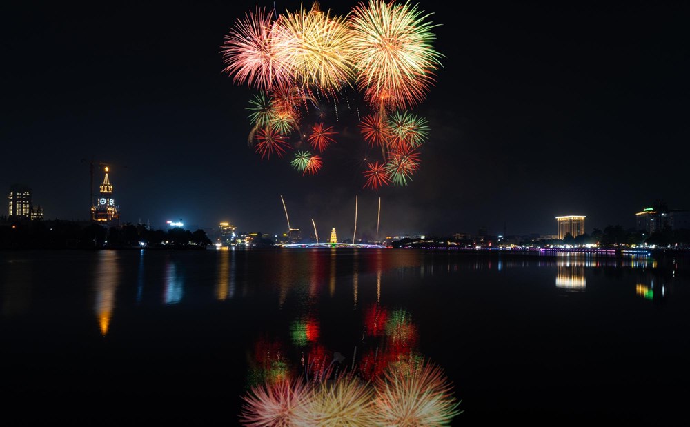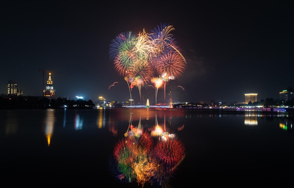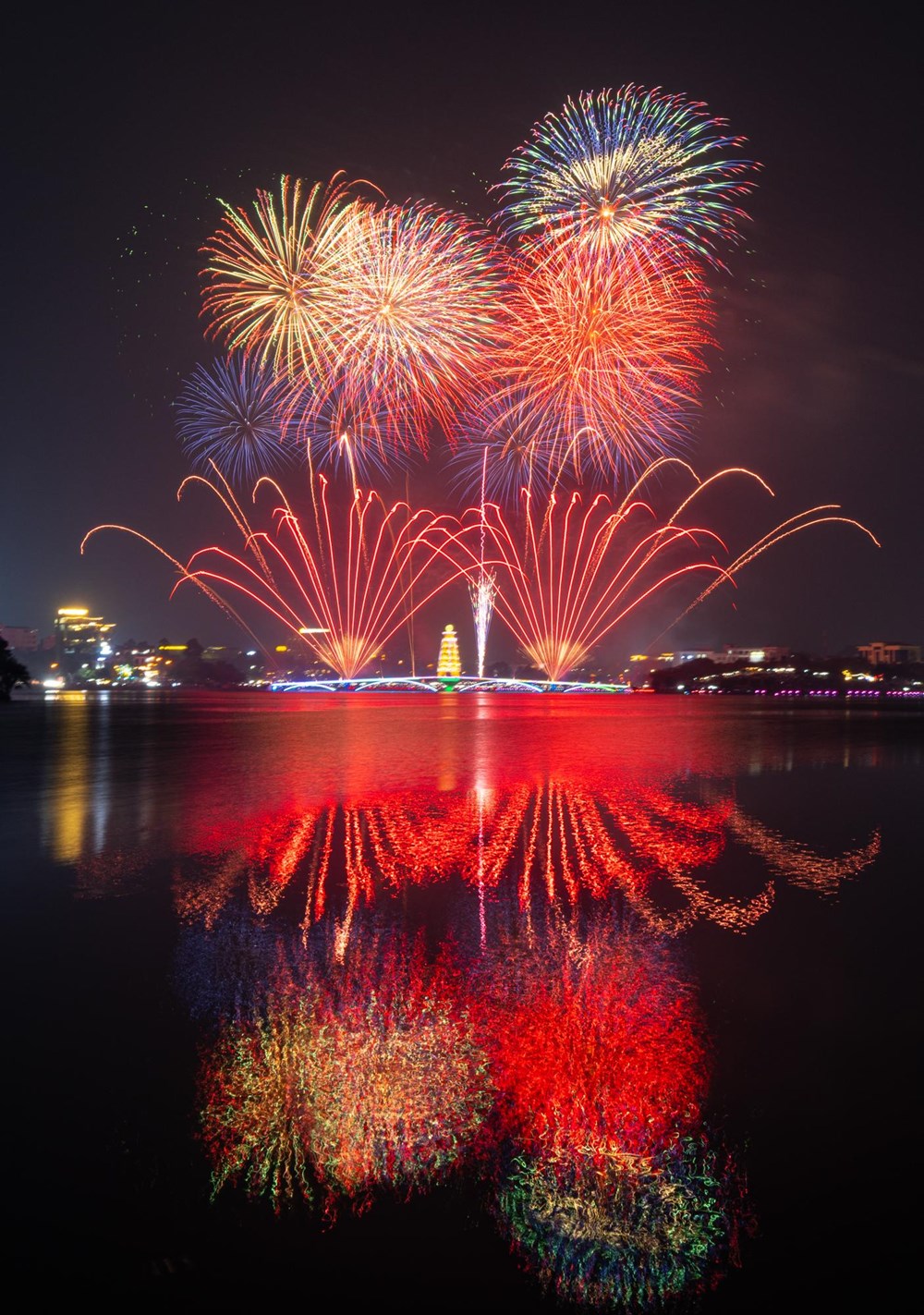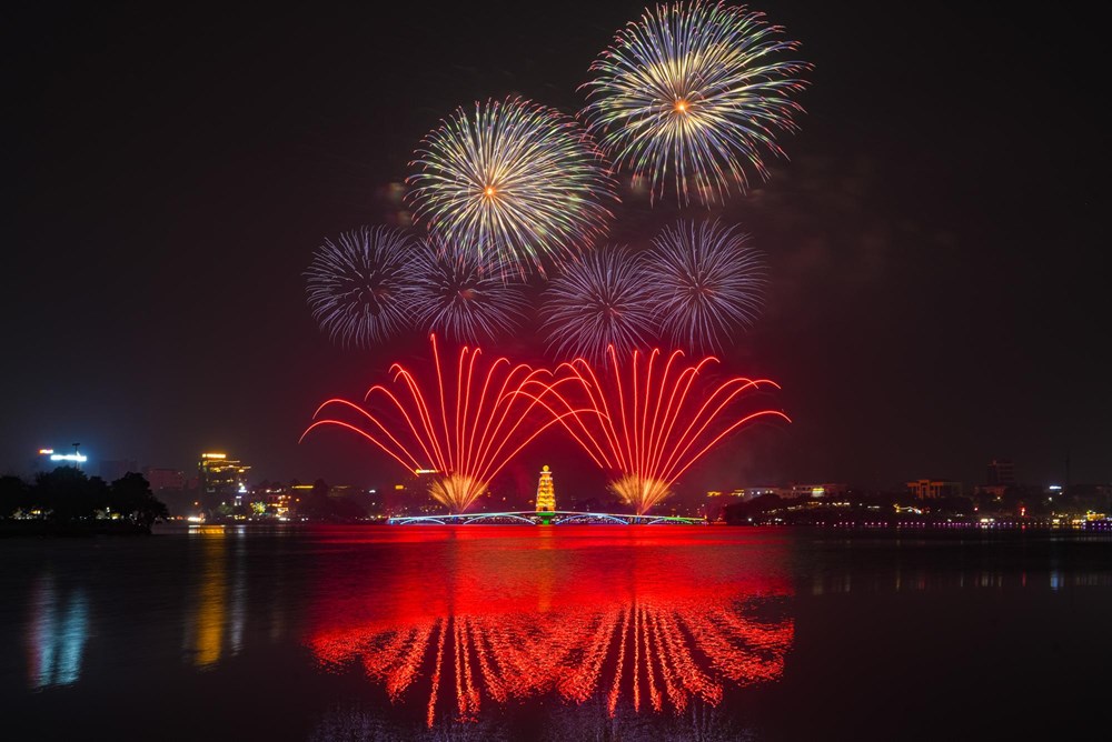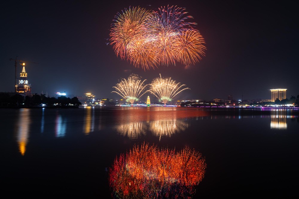 Những bông pháo hoa nhiều màu sắc liên tục được bắn lên cao, tạo nên khung cảnh huyền ảo bên hồ